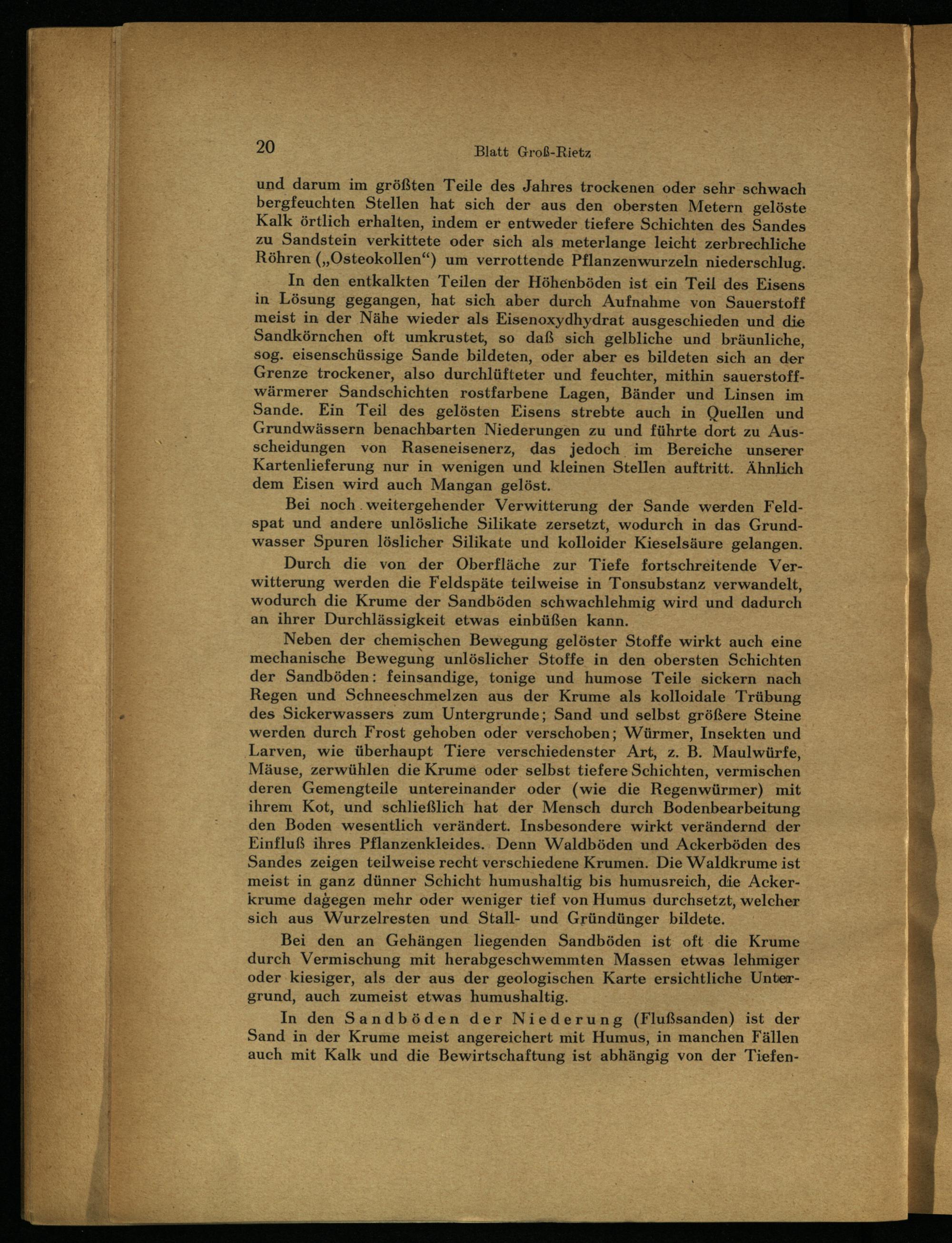 und darum im größten Teile des Jahres trockenen oder sehr schwach bergfeuchten Stellen hat sich der aus den obersten Metern gelöste Kalk örtlich erhalten, indem er entweder tiefere Schichten des Sandes zu Sandstein verkittete oder sich als meterlange leicht zerbrechliche Röhren( ,, Osteokollen") um verrottende Pflanzenwurzeln niederschlug. In den entkalkten Teilen der Höhenböden ist ein Teil des Eisens in Lösung gegangen, hat sich aber durch Aufnahme von Sauerstoff meist in der Nähe wieder als Eisenoxydhydrat ausgeschieden und die Sandkörnchen oft umkrustet, so daß sich gelbliche und bräunliche, sog. eisenschüssige Sande bildeten, oder aber es bildeten sich an der Grenze trockener, also durchlüfteter und feuchter, mithin sauerstoffwärmerer Sandschichten rostfarbene Lagen, Bänder und Linsen im Sande. Ein Teil des gelösten Eisens strebte auch in Quellen und Grundwässern benachbarten Niederungen zu und führte dort zu Ausscheidungen von Raseneisenerz, das jedoch im Bereiche unserer Kartenlieferung nur in wenigen und kleinen Stellen auftritt. Ähnlich dem Eisen wird auch Mangan gelöst.