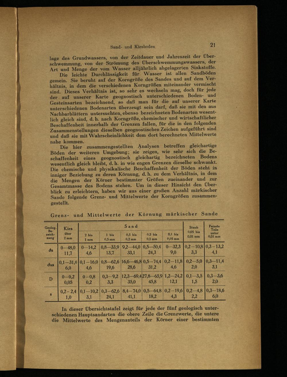 Die hier zusammengestellten Analysen betreffen gleichartige Böden der weiteren Umgebung; sie zeigen, wie sehr sich die Beschaffenheit eines geognostisch gleichartig bezeichneten Bodens wesentlich gleich bleibt, d. h. in wie engen Grenzen dieselbe schwankt. Die chemische und physikalische Beschaffenheit der Böden steht in inniger Beziehung zu deren Körnung, d. h. zu dem Verhältnis, in dem die Mengen der Körner bestimmter Größen zueinander und zur Gesamtmasse des Bodens stehen. Um in dieser Hinsicht den Überblick zu erleichtern, haben wir aus einer großen Anzahl märkischer Sande folgende Grenz- und Mittelwerte der Korngrößen zusammengestellt.