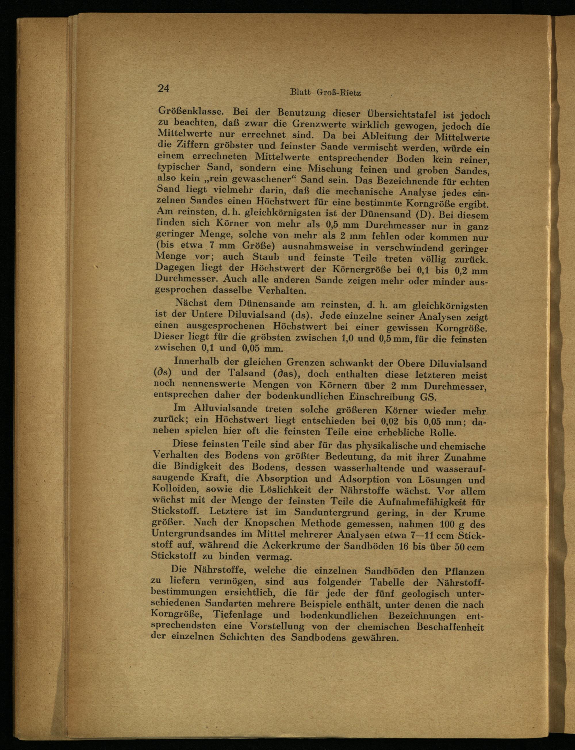 Die Nährstoffe, welche die einzelnen Sandböden den Pflanzen zu liefern vermögen, sind aus folgender Tabelle der Nährstoffbestimmungen ersichtlich, die für jede der fünf geologisch unterschiedenen Sandarten mehrere Beispiele enthält, unter denen die nach Korngröße, Tiefenlage und bodenkundlichen Bezeichnungen entsprechendsten eine Vorstellung von der chemischen Beschaffenheit der einzelnen Schichten des Sandbodens gewähren.