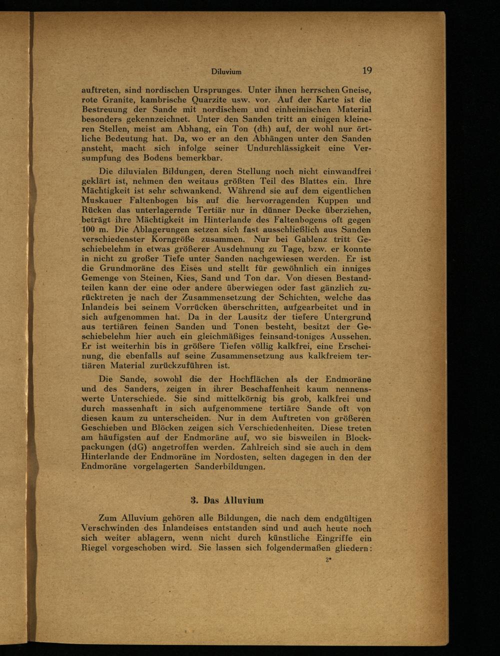 Die diluvialen Bildungen, deren Stellung noch nicht einwandfrei geklärt ist, nehmen den weitaus größten Teil des Blattes ein. Ihre Mächtigkeit ist sehr schwankend. Während sie auf dem eigentlichen Muskauer Faltenbogen bis auf die hervorragenden Kuppen und Rücken das unterlagernde Tertiär nur in dünner Decke überziehen, beträgt ihre Mächtigkeit im Hinterlande des Faltenbogens oft gegen 100 m. Die Ablagerungen setzen sich fast ausschließlich aus Sanden verschiedenster Korngröße zusammen. Nur bei Gablenz tritt Geschiebelehm in etwas größerer Ausdehnung zu Tage, bzw. er konnte in nicht zu großer Tiefe unter Sanden nachgewiesen werden. Er ist die Grundmoräne des Eises und stellt für gewöhnlich ein inniges Gemenge von Steinen, Kies, Sand und Ton dar. Von diesen Bestandteilen kann der eine oder andere überwiegen oder fast gänzlich‘ zurücktreten je nach der Zusammensetzung der Schichten, welche das Inlandeis bei seinem Vorrücken überschritten, aufgearbeitet und in sich aufgenommen hat. Da in der Lausitz der tiefere Untergrund aus tertiären feinen Sanden und Tonen besteht, besitzt der Geschiebelehm hier auch ein gleichmäßiges feinsand-toniges Aussehen. Er ist weiterhin bis in größere Tiefen völlig kalkfrei, eine Erscheinung, die ebenfalls auf seine Zusammensetzung aus Kalkfreiem tertiären Material zurückzuführen ist.