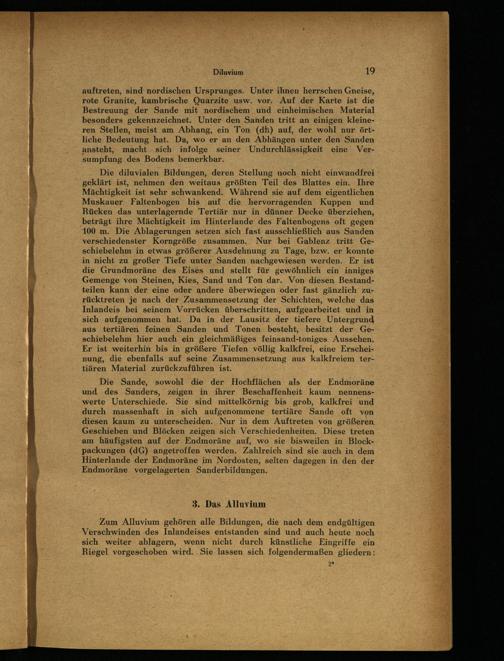 Die Sande, sowohl die der Hochflächen als der Endmoräne und des Sanders, zeigen in ihrer Beschaffenheit kaum nennenswerte Unterschiede. Sie sind mittelkörnig bis grob, kalkfrei und durch massenhaft in sich aufgenommene_tertiäre Sande oft von diesen kaum zu unterscheiden... Nur in dem Auftreten von größeren Geschieben und Blöcken zeigen sich Verschiedenheiten. Diese treten am häufigsten auf der Endmoräne auf, wo sie bisweilen in Blockpackungen(dG) angetroffen werden. Zahlreich sind sie auch in dem Hinterlande der Endmoräne im Nordosten, selten dagegen in den der Endmoräne vorgelagerten Sanderbildungen.