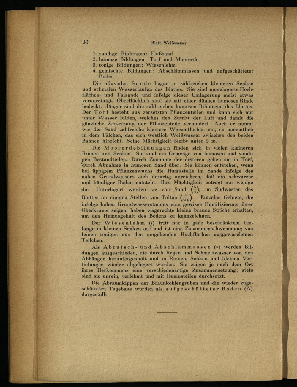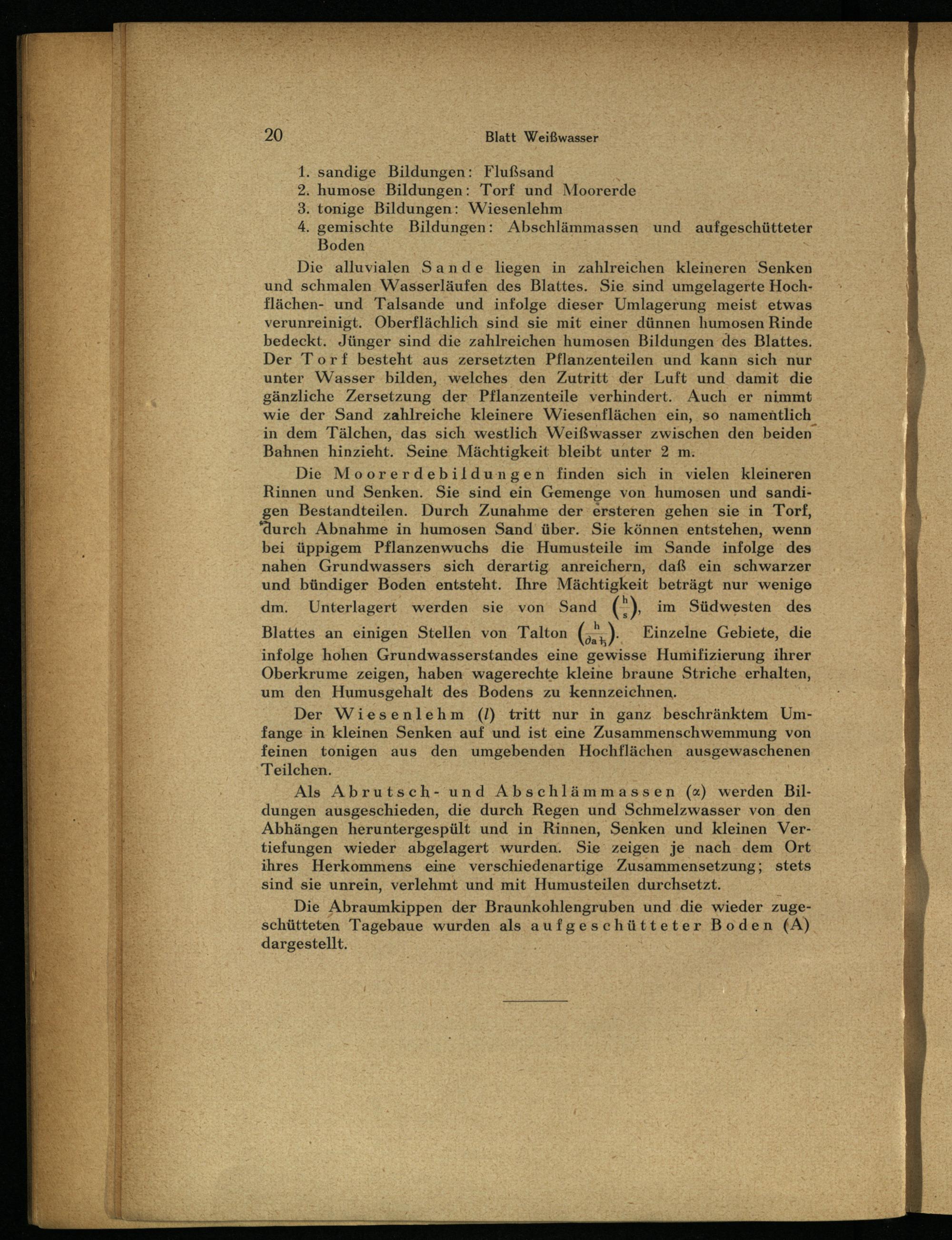 Die alluvialen Sande liegen in zahlreichen kleineren Senken und schmalen Wasserläufen des Blattes. Sie sind umgelagerte Hochflächen- und Talsande und infolge dieser Umlagerung meist etwas verunreinigt. Oberflächlich sind sie mit einer dünnen humosen Rinde bedeckt. Jünger sind die zahlreichen humosen Bildungen des Blattes. Der Torf besteht aus zersetzten Pflanzenteilen und kann sich nur unter Wasser bilden, welches den Zutritt der Luft und damit die gänzliche Zersetzung der Pflanzenteile verhindert. Auch er nimmt wie der Sand zahlreiche kleinere Wiesenflächen ein, so namentlich in dem Tälchen, das sich westlich Weißwasser zwischen den beiden Bahnen hinzieht. Seine Mächtigkeit bleibt unter 2 m: