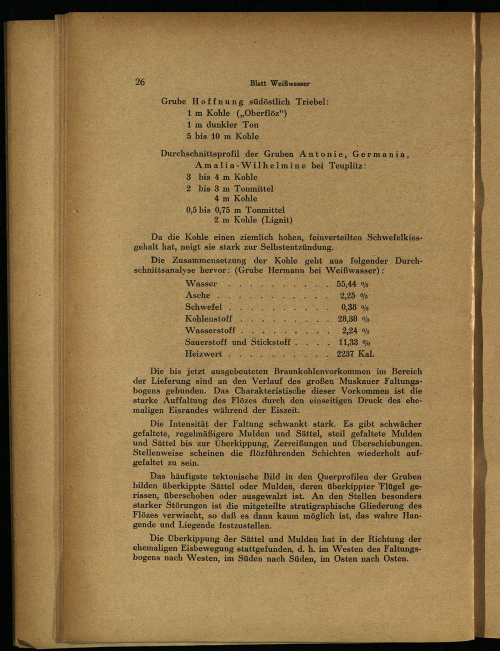 Die Zusammensetzung der Kohle geht aus folgender Durchschnittsanalyse hervor:(Grube Hermann bei Weißwasser ): Wasser, N 0,44 0% Asche 2250 Schwefel SO, 38 0 Kohlenstoff N 8,80 0% Wasserstoff.... 24 Sauerstoff und Stickstoff‘. 11,33. 0% Heizwert+ 2 2200 Kal