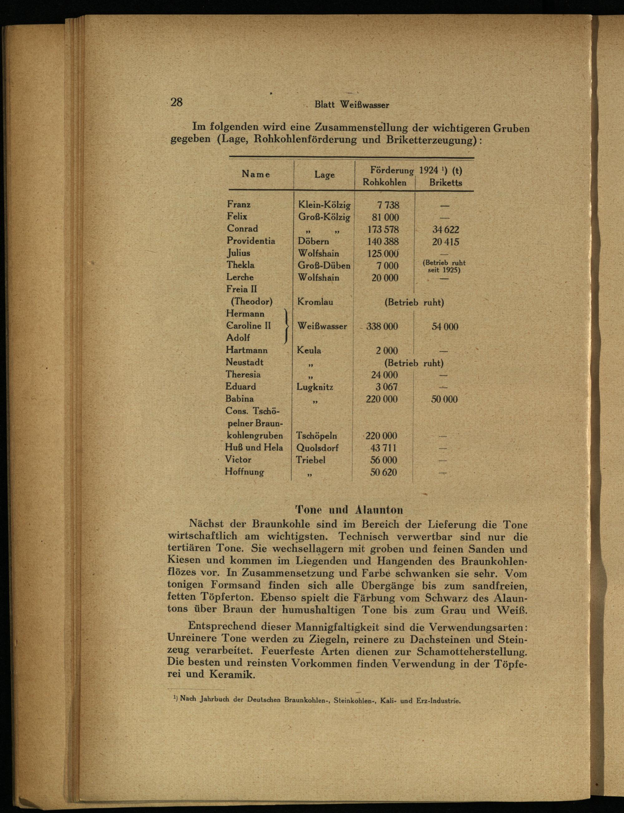 Förderung 1924!)(t) Lage Rohkohlen 4 Briketts Klein-Kölzig| 7738— Felix Groß-Kölzig| 81000— Conrad HET STB 622 Providentia| Döbern 140388 20 415 Julius Wolfshain 125.000— Thekla Groß-Düben| 7000| Geh hzubt Lerche Wolfshain|. 20000|:— Freia II|: (Theodor) Kromlau (Betrieb ruht) Hermann| Caroline II| Weißwasser- 338 000| Adolf;|| Hartmann„| Keula | 2000. Neustadt„|(Betrieb ruht) Theresia az| 24000|— Eduard Lugknitz| 3.067: HS Babina A| 220 000| 50 000 Cons. Tschö-|| pelner Braun-| _ kohlengruben.| Tschöpeln| 220 000 Huß und Hela| Quolsdorf 43711 - Victor Triebel ‚56.000 Hoffnung{ 50 620