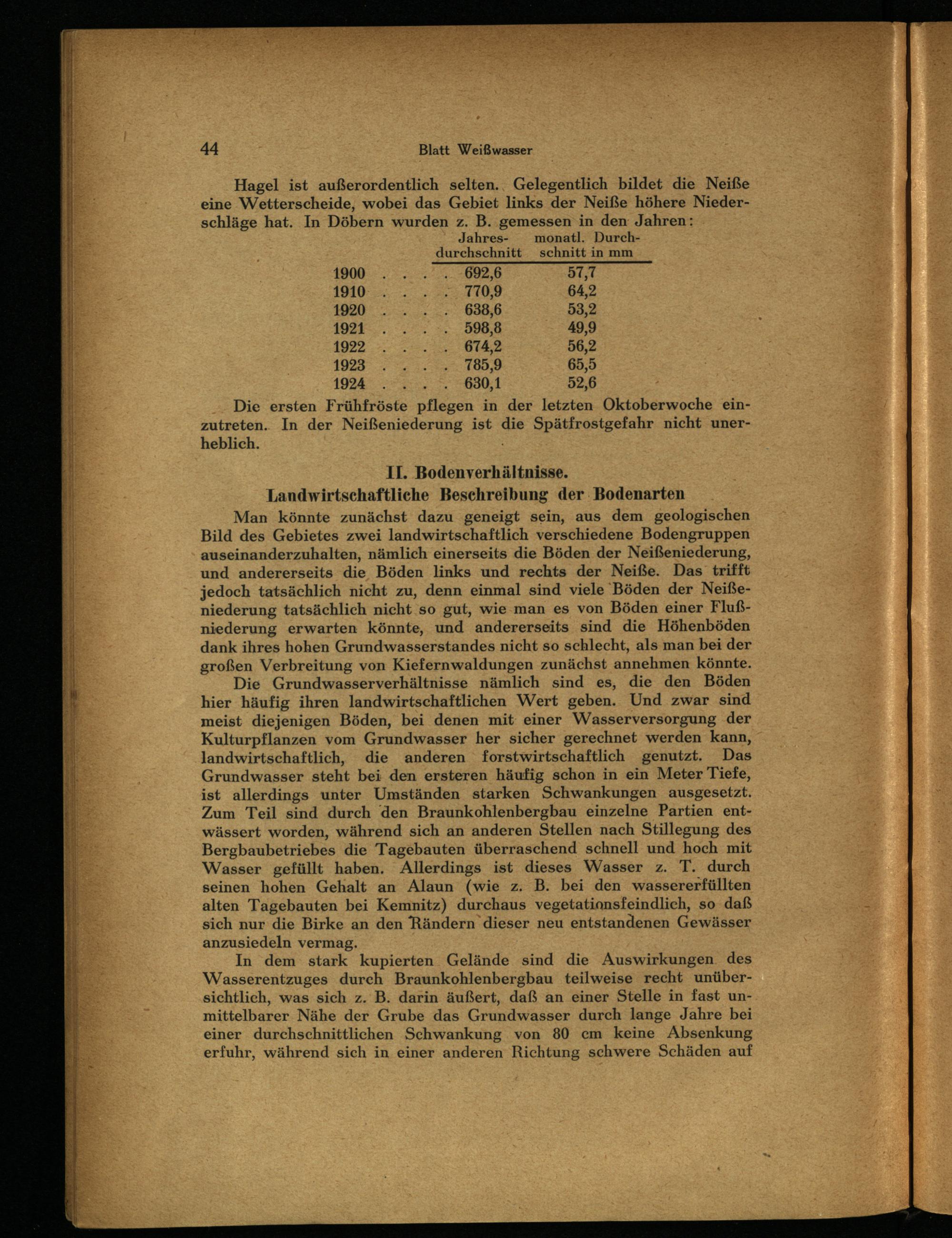 Man könnte zunächst dazu geneigt sein, aus dem geologischen Bild des Gebietes zwei landwirtschaftlich verschiedene Bodengruppen auseinanderzuhalten, nämlich einerseits die Böden der Neißeniederung, und andererseits die Böden links und rechts der Neiße . Das’ trifft jedoch tatsächlich nicht zu, denn einmal sind viele Böden der Neißeniederung tatsächlich nicht so gut, wie man es von Böden einer Flußniederung erwarten könnte, und andererseits sind die Höhenböden dank ihres hohen Grundwasserstandes nicht so schlecht, als man bei der großen Verbreitung von Kiefernwaldungen zunächst annehmen könnte.