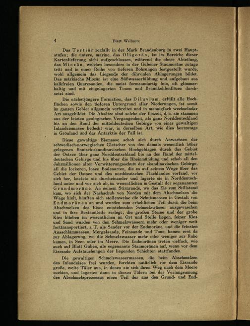 Das Tertiär zerfällt in der Mark Brandenburg in zwei Hauptstufen; die untere, marine, das Oligozän, ist im Bereiche dieser Kartenlieferung nicht aufgeschlossen, während die obere Abteilung, das Miozän, welches besonders in der Gubener Staumoräne zutage tritt und in einer Reihe von tieferen Bohrungen festgestellt wurde, wohl allgemein das Liegende der diluvialen Ablagerungen bildet. Das märkische Miozän ist eine Süßwasserbildung und aufgebaut aus’ kalkfreien Quarzsanden, die meist formsandartig fein, oft glimmerhaltig und mit eingelagerten Tonen und Braunkohlenflözen durchsetzt sind.