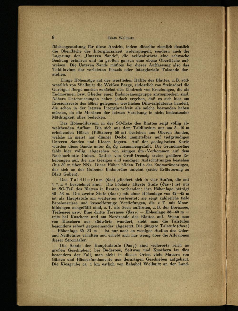 Einige Höhenzüge auf der westlichen Hälfte des Blattes, z. B. südwestlich von Wellmitz die Weißen Berge, südöstlich von Steinsdorf die Garbigen Berge machen zunächst-den Eindruck von Erhebungen, die als Endmoränen bzw. Glieder einer Endmoränengruppe anzusprechen sind. Nähere Untersuchungen haben jedoch ergeben, daß es sich hier um Erosionsreste des höher gelegenen westlichen Diluvialplateaus handelt, die schon in der letzten Interglazialzeit als solche bestanden haben müssen, da die Moränen der letzten Vereisung in nicht bedeutender Mächtigkeit alles bedecken.