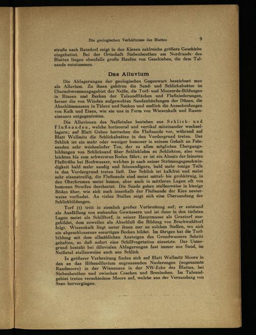Torf(t) tritt in ziemlich großer Verbreitung auf; er entstand als Ausfällung von stehenden Gewässern und ist dann in den tiefsten Lagen meist als Schilftorf, in seiner Hauptmasse als Grastorf ausgebildet, dem zuweilen als Abschluß die Bildung von Bruchwaldtorf folgt. Wiesenkalk liegt unter ihnen nur an solchen Stellen, wo sich ein abgeschlossenes seeartiges Becken bildet. Im übrigen hat die Torfbildung mit dem allmählichen Ansteigen des Grundwassers Schritt gehalten, so daß sofort eine Schilfvegetation einsetzte. Der Untergrund besteht bei diluvialen Ablagerungen fast immer aus Sand, im Neißetal stellenweise auch aus Schlick.