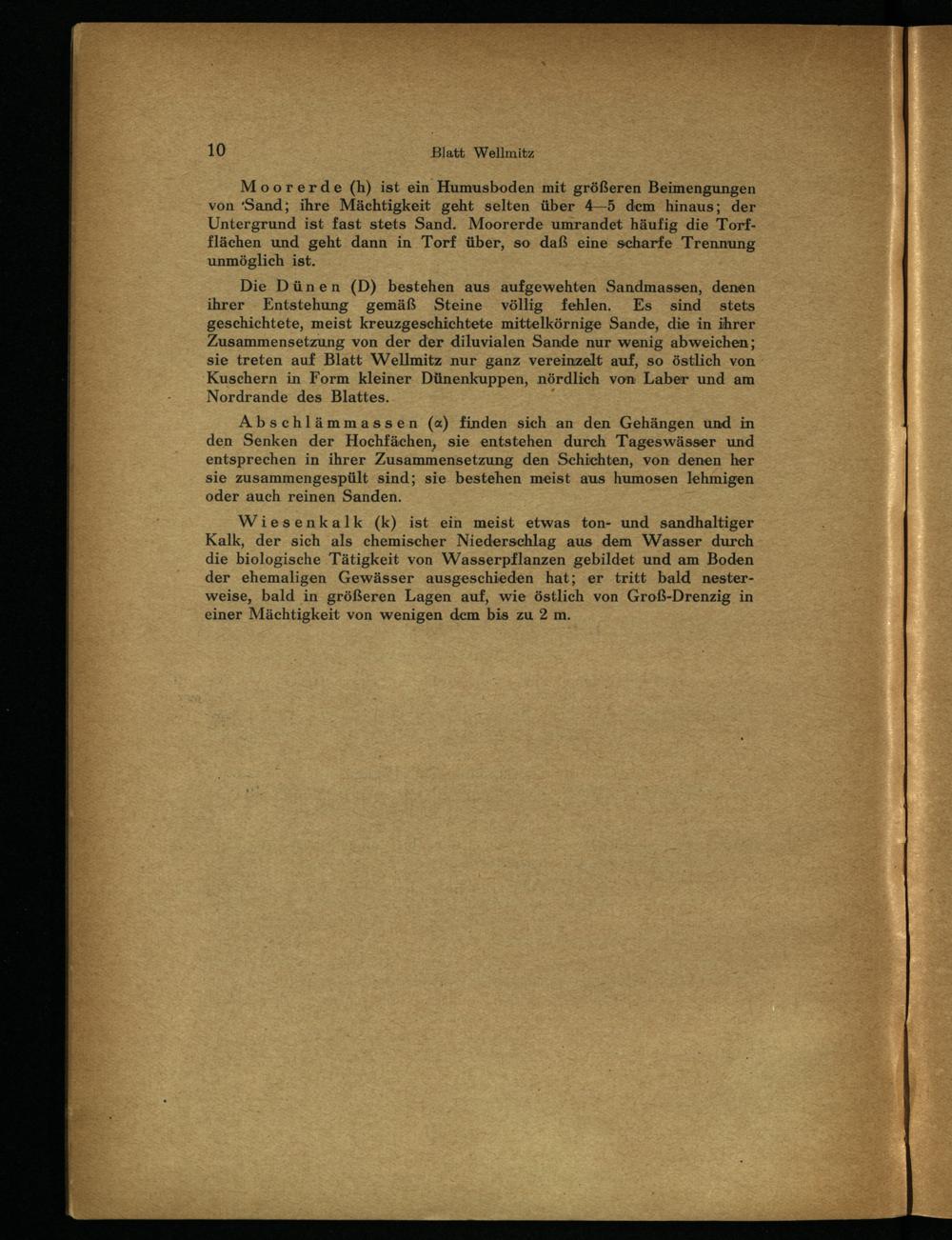 Die Dünen(D) bestehen aus aufgewehten Sandmassen, denen ihrer Entstehung gemäß Steine völlig fehlen. Es sind stets geschichtete, meist kreuzgeschichtete mittelkörnige Sande, die in ihrer Zusammensetzung von der der diluvialen Sande nur wenig abweichen; sie treten auf Blatt Wellmitz nur ganz vereinzelt auf, so östlich von Kuschern in Form kleiner Dünenkuppen, nördlich von Laber und am Nordrande des Blattes..