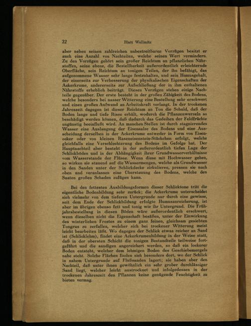 22 Blatt Wellmitz aber neben seinen zahlreichen unbestreitbaren Vorzügen besitzt er auch eine Anzahl von Nachteilen, welche seinen Wert vermindern. Zu den Vorzügen gehört sein großer Reichtum an pflanzlichen Nährstoffen, seine ebene, die Bestellbarkeit außerordentlich erleichternde Oberfläche, sein Reichtum an tonigen Teilen, der ihn befähigt, das aufgenommene Wasser sehr lange festzuhalten, und sein Humusgehalt, der einerseits zur Verbesserung der physikalischen Eigenschaften der Ackerkrume, andererseits zur Aufschließung der in ihm enthaltenen