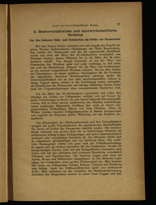 Mit dem Namen Guben verbindet man seit langem den Begriff der neben Werder bedeutsamsten Obstkammer der Mark Brandenburg. Das Gebiet der Staäumoräne und die ihr angrenzende Hochfläche wurde seit etwa der Mitte des 13. Jahrhunderts vornehmlich zum Weinbau benutzt, dessen Blütezeit bis in die Mitte des 19. Jahrhunderts anhielt. Von diesem Zeitpunkt an hat der Obst- und Gemüsebau den Weinbau mehr und mehr verdrängt, so daß heute nur noch die Bezeichnung„Winzer“ für die Obst- und Gemüsebauer an den ehemals ausgedehnten Weinbau erinnert. Als mit dem Ausbau der Eisenbahnen ein immer größeres Absatzgebiet für die Produkte der eigentlichen deutschen Weinbaugebiete entstand, mußte die Unwirtschaftlichkeit des an sich nicht standortsgemäßen Anbaus in dieser Gegend immer stärker in die Erscheinung treten, umsomehr, als Krankheiten des Weinstocks und häufige Mißernten letzten Endes auch nur Folgeerscheinungen eines unzureichenden. Standortes sind.