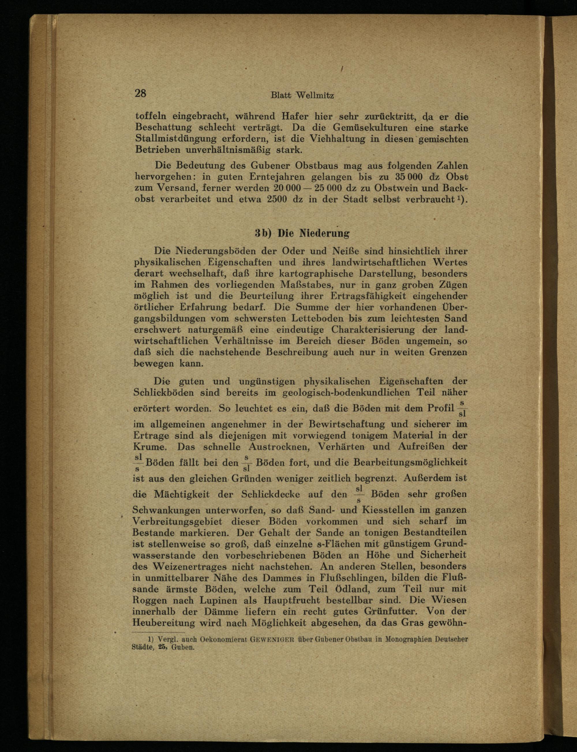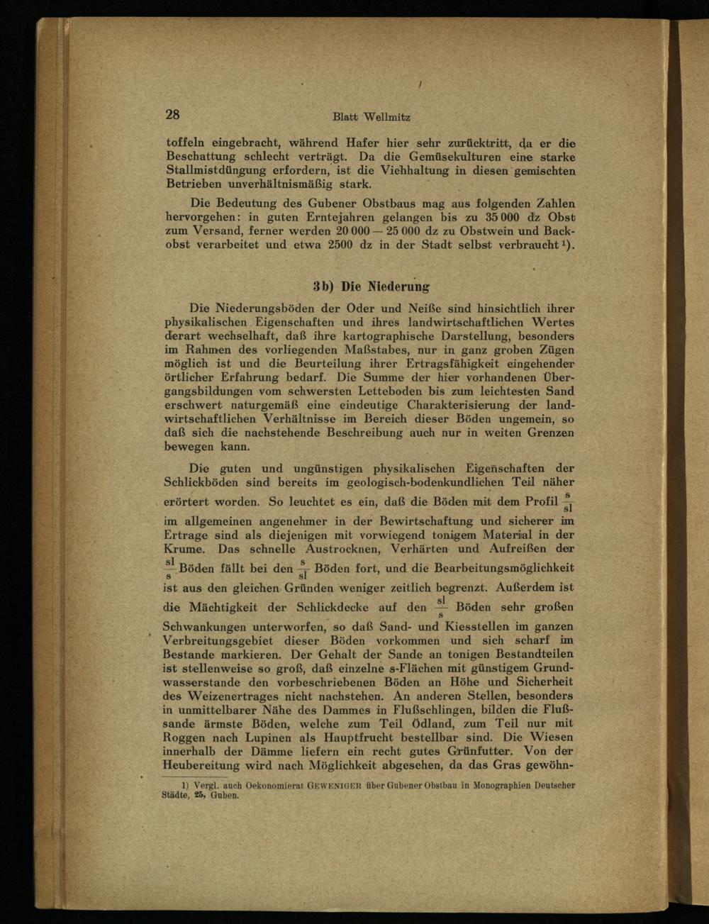 Die Niederungsböden der Oder und Neiße sind hinsichtlich ihrer physikalischen Eigenschaften und ihres landwirtschaftlichen Wertes derart wechselhaft, daß ihre kartographische Darstellung, besonders im Rahmen des vorliegenden Maßstabes, nur in ganz groben Zügen möglich ist und die Beurteilung ihrer Ertragsfähigkeit eingehender örtlicher Erfahrung bedarf. Die Summe der hier vorhandenen Übergangsbildungen vom schwersten Letteboden bis zum leichtesten Sand erschwert naturgemäß eine eindeutige Charakterisierung der landwirtschaftlichen Verhältnisse im Bereich dieser Böden ungemein, so daß sich die nachstehende Beschreibung auch nur in weiten Grenzen bewegen kann.