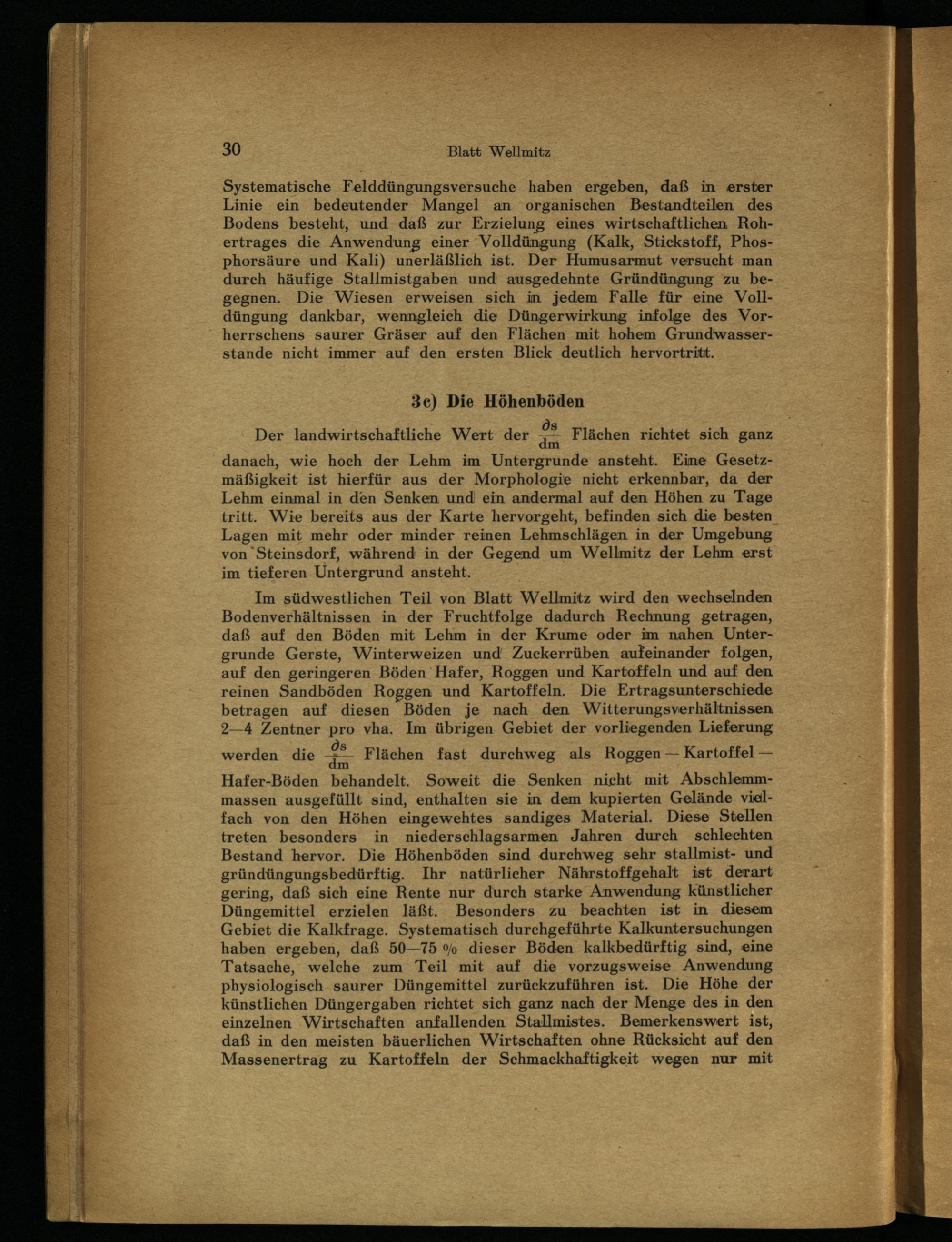 3c) Die Höhenböden Der landwirtschaftliche Wert der ee danach, wie hoch der Lehm im Untergrunde ansteht. Eine Gesetzmäßigkeit ist hierfür aus der Morphologie nicht erkennbar, da der Lehm einmal in den Senken und ein andermal auf den Höhen zu Tage tritt. Wie bereits aus der Karte hervorgeht, befinden sich die besten Lagen mit mehr oder minder reinen Lehmschlägen in der Umgebung von Steinsdorf, während in der Gegend um Wellmitz der Lehm erst im tieferen Untergrund ansteht.
