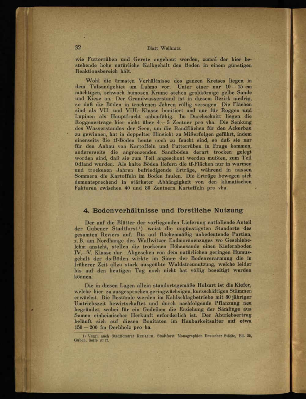 Der auf die Blätter der vorliegenden Lieferung entfallende Anteil der Gubener Stadtforst!) weist die ungünstigsten Standorte des gesamten Reviers auf. Bis auf flächenmäßig unbedeutende Partien, z.B. am Nordhange des Wallwitzer Endmoränenzuges wo Geschiebelehm ansteht, stellen die trockenen Höhensande einen Kiefernboden IV.—V, Klasse dar. Abgesehen von dem natürlichen geringen Humusgehalt der ds-Böden wirkte im Sinne der Bodenverarmung die in früherer Zeit allzu stark ausgeübte Waldstreunutzung, welche leider bis auf den heutigen Tag noch nicht hat völlig beseitigt werden können.