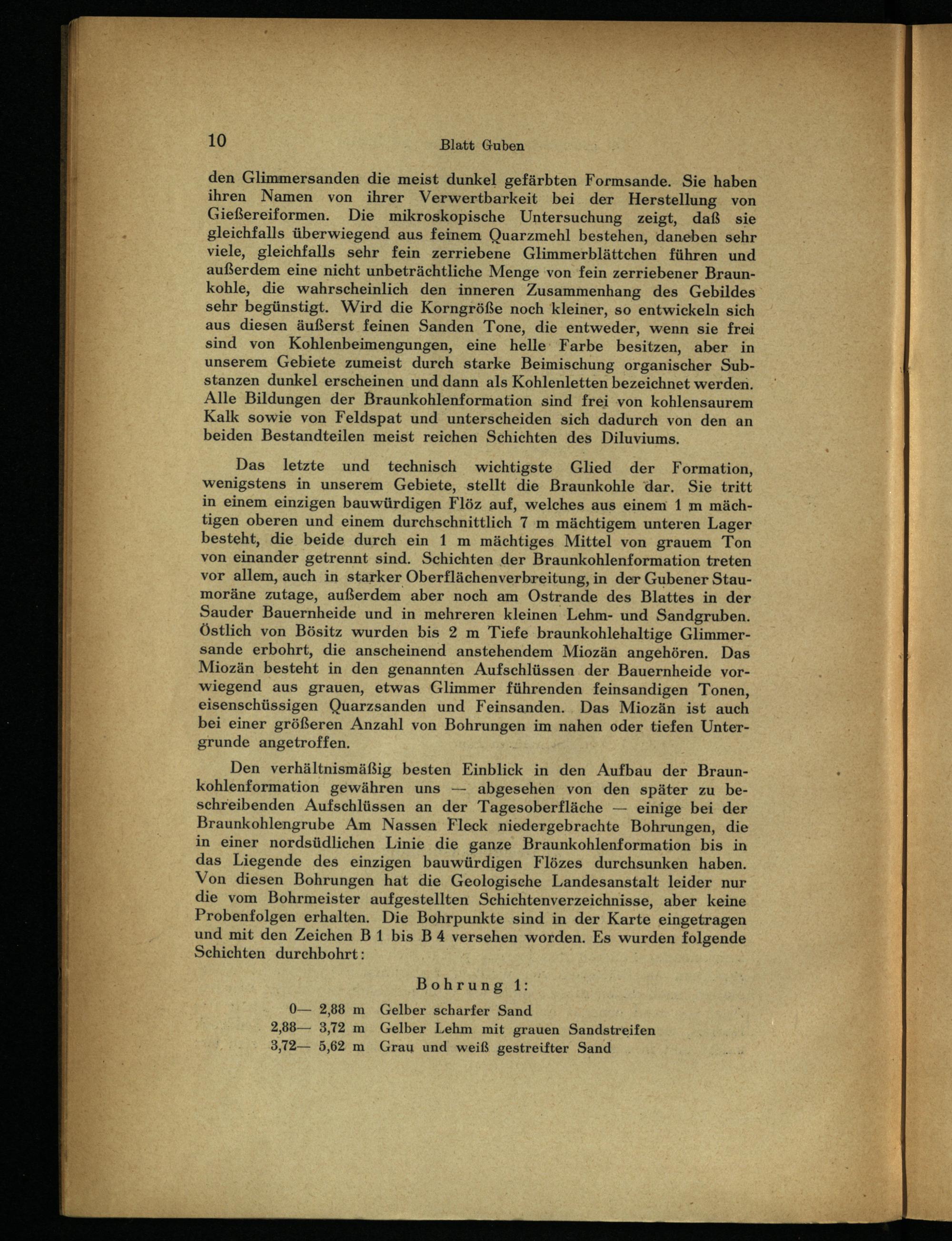 Das letzte und technisch wichtigste Glied der Formation, wenigstens in unserem Gebiete, stellt die Braunkohle dar. Sie tritt in einem einzigen bauwürdigen Flöz auf, welches aus einem 1 m mächtigen oberen und einem durchschnittlich 7 m mächtigem unteren Lager besteht, die beide durch ein 1 m mächtiges Mittel von grauem Ton von einander getrennt sind. Schichten der Braunkohlenformation treten vor allem, auch in starker Oberflächenverbreitung, in der Gubener Staumoräne zutage, außerdem aber noch am Ostrande des Blattes in der Sauder Bauernheide und in mehreren kleinen Lehm- und Sandgruben. Östlich von Bösitz wurden bis 2 m Tiefe braunkohlehaltige Glimmersande erbohrt, die anscheinend anstehendem Miozän angehören. Das Miozän besteht in den genannten Aufschlüssen der Bauernheide vorwiegend aus grauen, etwas Glimmer führenden feinsandigen Tonen, eisenschüssigen Quarzsanden und Feinsanden. Das Miozän ist auch bei einer größeren Anzahl von Bohrungen im nahen oder tiefen Untergrunde angetroffen.