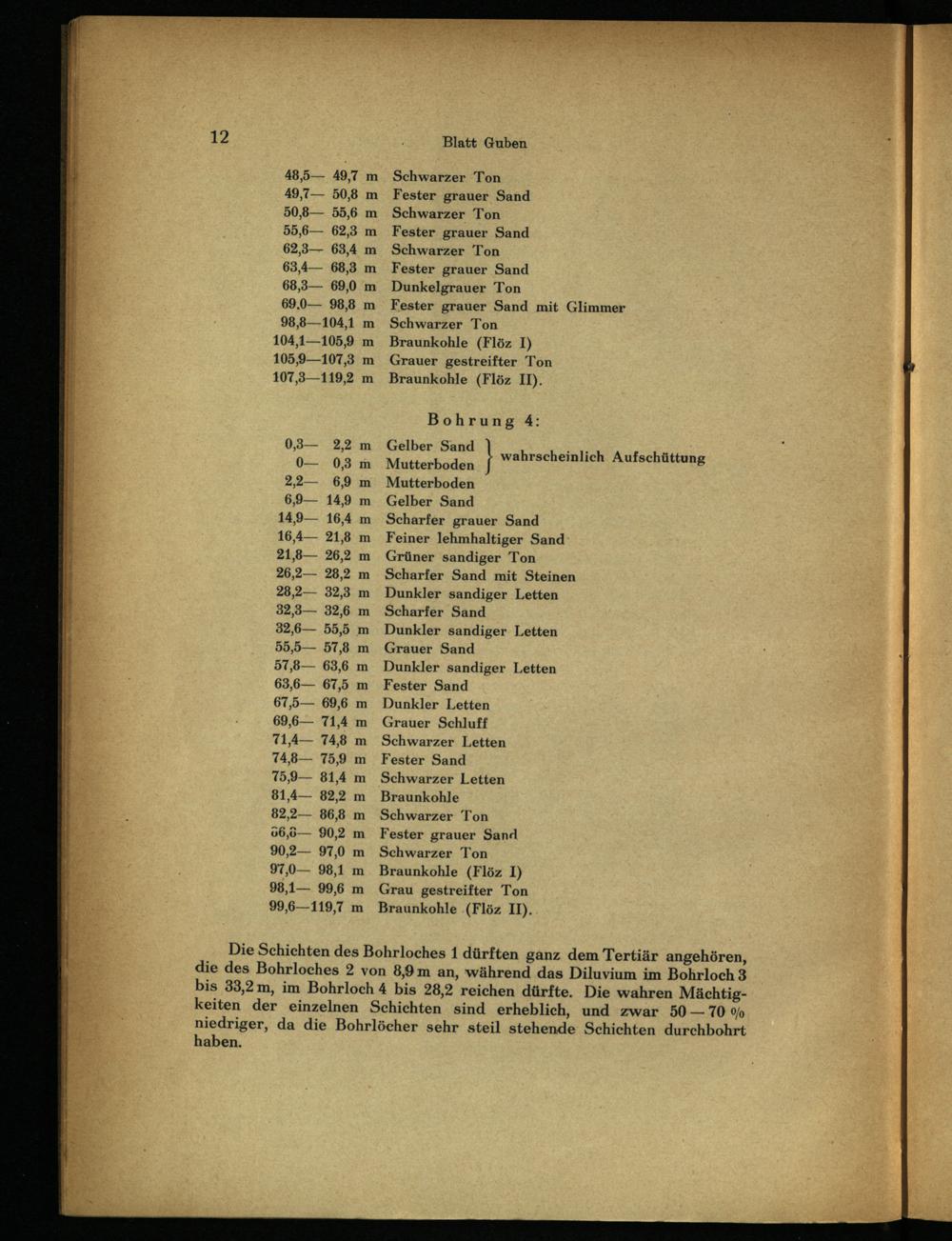 Die Schichten des Bohrloches 1 dürften ganz dem Tertiär angehören, die des Bohrloches 2 von 8,9 m an, während das Diluvium im Bohrloch 3 bis 33,2 m, im Bohrloch 4 bis 28,2 reichen dürfte. Die wahren Mächtigkeiten der einzelnen Schichten sind erheblich, und zwar 50—70% niedriger, da die Bohrlöcher sehr steil stehende Schichten durchbohrt haben.