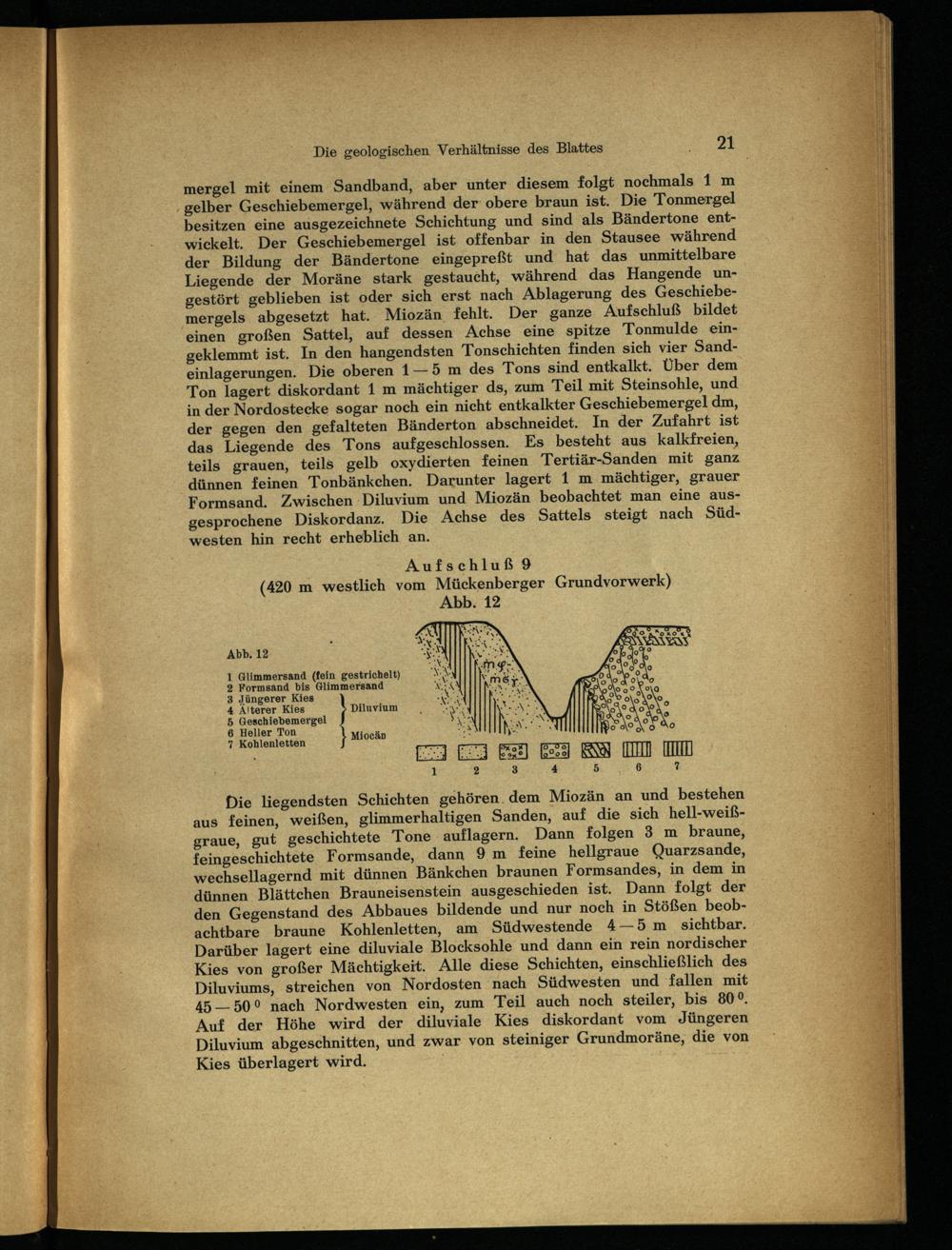 Die liegendsten Schichten gehören. dem Miozän an und bestehen aus feinen, weißen, glimmerhaltigen Sanden, auf die sich hell-weißgraue, gut geschichtete Tone auflagern. Dann folgen 3 m braune, feingeschichtete Formsande, dann 9 m feine hellgraue Quarzsande, wechsellagernd mit dünnen Bänkchen braunen Formsandes, in dem in dünnen Blättchen Brauneisenstein ausgeschieden ist. Dann folgt der den Gegenstand des Abbaues bildende und nur noch in Stößen beobachtbare braune Kohlenletten, am Südwestende 4—5 m sichtbar. Darüber lagert eine diluviale Blocksohle und dann ein rein nordischer Kies von großer Mächtigkeit. Alle diese Schichten, einschließlich des Diluviums, streichen von Nordosten nach Südwesten und fallen mit 45—50 9 nach Nordwesten ein, zum Teil auch noch steiler, bis 80°. Auf der Höhe wird der diluviale Kies diskordant vom Jüngeren Diluvium abgeschnitten, und zwar von steiniger Grundmoräne, die von Kies überlagert wird.