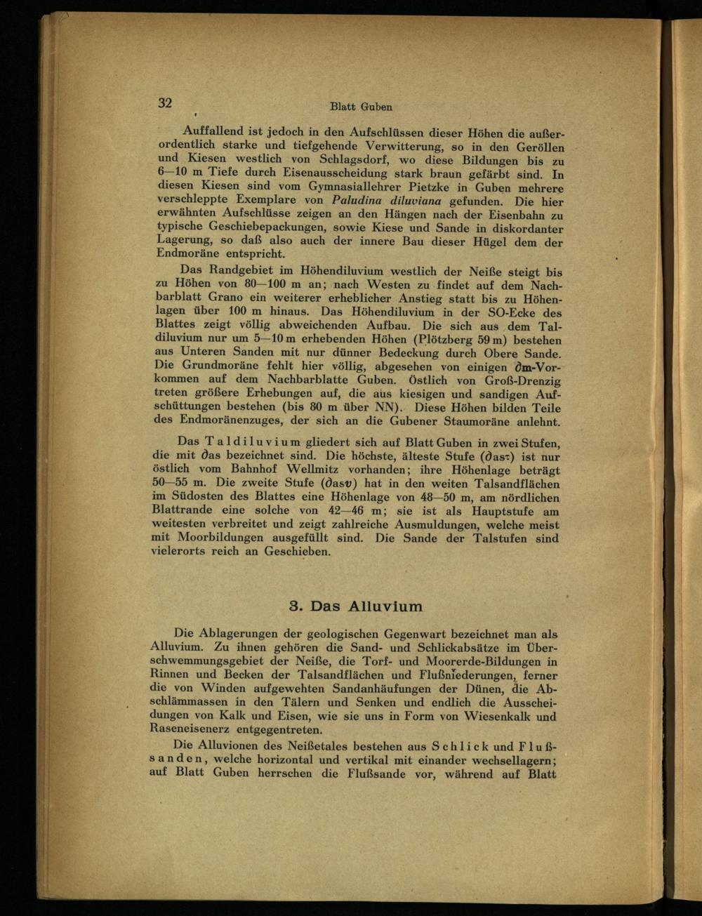 Die Alluvionen des Neißetales bestehen aus Schlick und Flußsanden, welche horizontal und vertikal mit einander wechsellagern; auf Blatt Guben herrschen die Flußsande vor, während auf Blatt