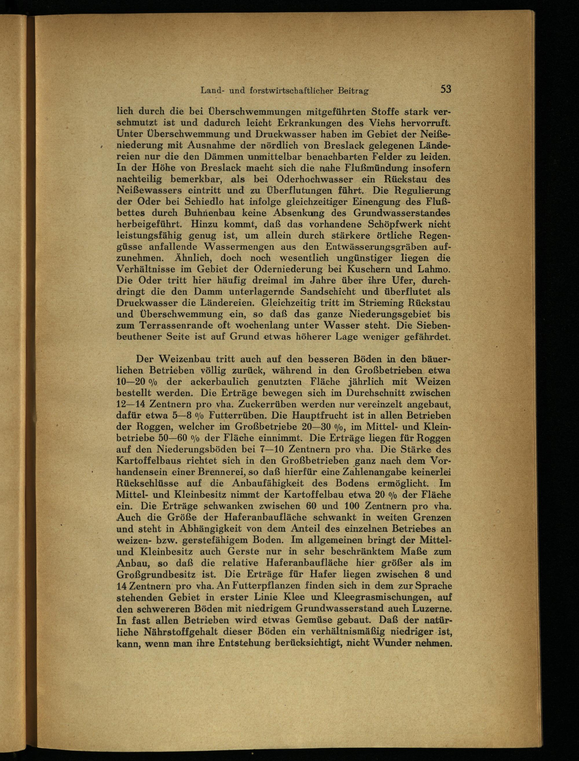 lich durch die bei Überschwemmungen mitgeführten Stoffe stark verschmutzt ist und dadurch leicht Erkrankungen des Viehs hervorruft. Unter Überschwemmung und Druckwasser haben im Gebiet der Neißeniederung mit Ausnahme der nördlich von Breslack gelegenen Ländereien nur die den Dämmen unmittelbar benachbarten Felder zu leiden. In der Höhe von Breslack macht sich die nahe Flußmündung insofern nachteilig bemerkbar, als bei Oderhochwasser ein Rückstau des Neißewassers eintritt und zu Überflutungen führt.. Die Regulierung der Oder bei Schiedlo hat infolge gleichzeitiger Einengung des Flußbettes durch Buhnenbau keine Absenkung des Grundwasserstandes herbeigeführt. Hinzu kommt, daß das vorhandene Schöpfwerk nicht leistungsfähig genug ist, um allein durch stärkere örtliche Regengüsse anfallende Wassermengen aus den Entwässerungsgräben aufzunehmen. Ähnlich, doch noch wesentlich ungünstiger liegen die Verhältnisse im Gebiet der Oderniederung bei Kuschern und Lahmo. Die Oder tritt hier häufig dreimal im Jahre über ihre Ufer, durchdringt die den Damm unterlagernde Sandschicht und überflutet als Druckwasser die Ländereien. Gleichzeitig tritt im Strieming Rückstau und Überschwemmung ein, so daß das ganze Niederungsgebiet bis zum Terrassenrande oft wochenlang unter Wasser steht. Die Siebenbeuthener Seite ist auf Grund etwas höherer Lage weniger gefährdet.
