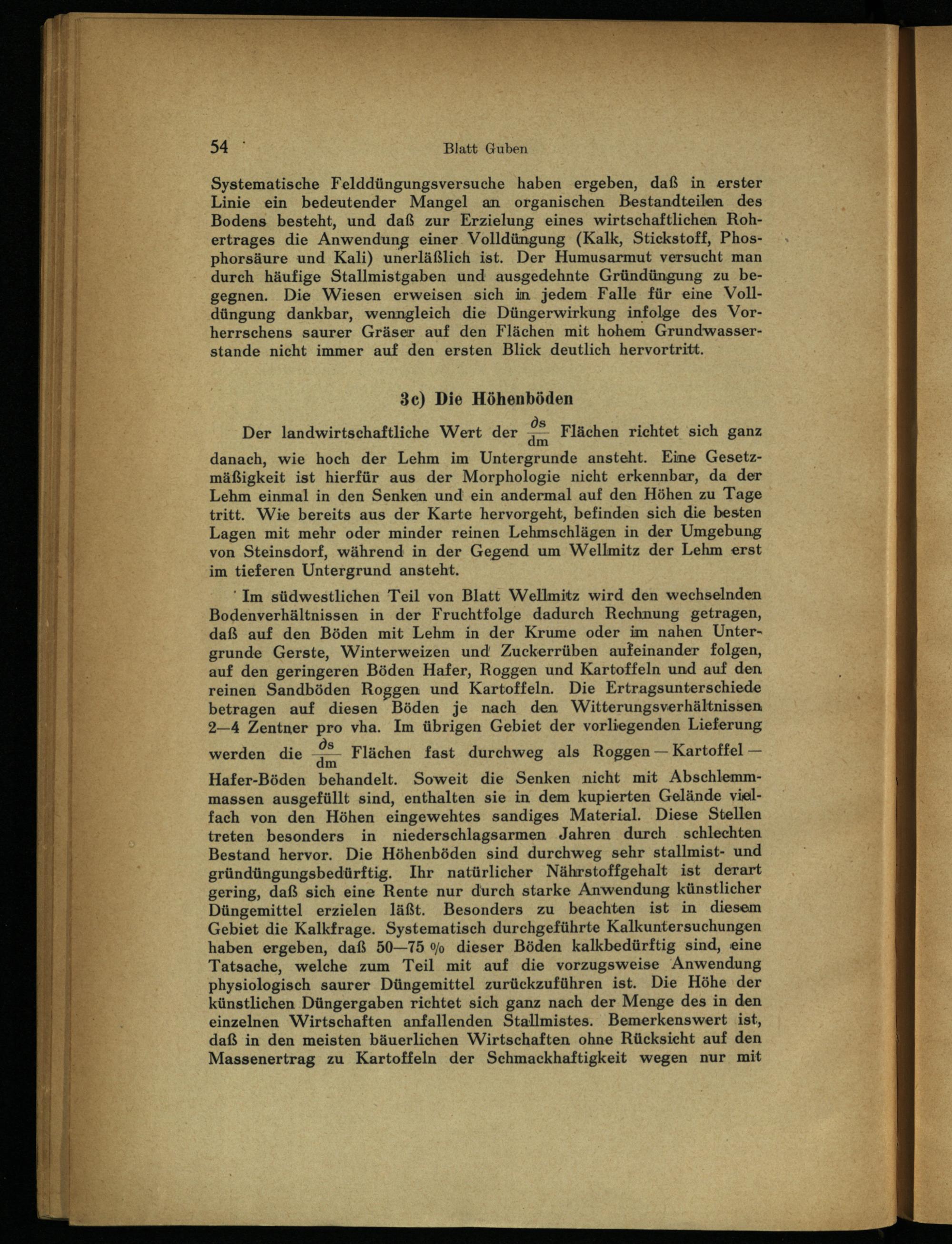 dm danach, wie hoch der Lehm im Untergrunde ansteht. Eine Gesetzmäßigkeit ist hierfür aus der Morphologie nicht erkennbar, da der Lehm einmal in den Senken und ein andermal auf den Höhen zu Tage tritt. Wie bereits aus der Karte hervorgeht, befinden sich die besten Lagen mit mehr oder minder reinen Lehmschlägen in der Umgebung von Steinsdorf, während in der Gegend um Wellmitz der Lehm erst