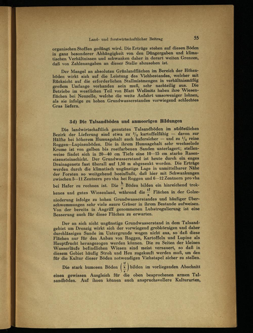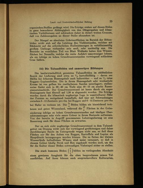 Die landwirtschaftlich genutzten‘ Talsandböden im südöstlichen Bezirk der Lieferung sind etwa zw 2/3 kartoffelfähig— davon zur Hälfte bei höherem Humusgehalt auch hafersicher— und zu!/3 reine Roggen—Lupinenböden. Die in ihrem Humusgehalt sehr wechselnde Krume ist von gelben bis rostfarbenen Sanden unterlagert; stellenweise findet sich in 20—40 cm Tiefe eine 10—15 cm starke Raseneisensteinschicht. Der Grundwasserstand ist heute durch ein enges Drainagenetz fast überall auf 1,50 m abgesenkt worden. Die Erträge werden durch die klimatisch ungünstige Lage in unmittelbarer Nähe der Forsten so weitgehend beeinflußt, daß hier mit Schwankungen zwischen 5—11 Zentnern pro vha bei Roggen und 6—12 Zentnern pro vha
