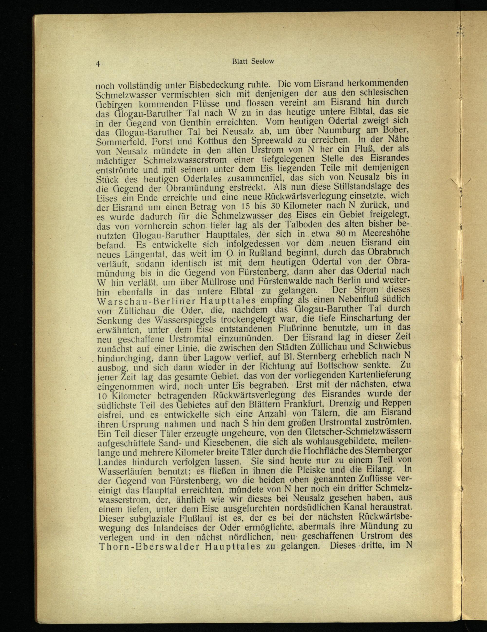noch vollständig unter Eisbedeckung ruhte. Die vom Eisrand herkommenden Schmelzwasser vermischten sich mit denjenigen der aus den schlesischen Gebirgen kommenden Flüsse und flossen vereint am Eisrand hin durch das Glogau -Baruther Tal nach W zu in das heutige untere Elbtal, das sie in der Gegend von Genthin erreichten. Vom heutigen Odertal zweigt sich das Glogau -Baruther Tal bei Neusalz ab, um über Naumburg am Bober, Sommerfeld, Forst und Kottbus den Spreewald zu erreichen. In der Nähe von Neusalz mündete in den alten Urstrom von N her ein Fluß, der als mächtiger Schmelzwasserstrom einer tiefgelegenen Stelle des Eisrandes entströmte und mit seinem unter dem Eis liegenden Teile mit demjenigen Stück des heutigen Odertales zusammenfiel, das sich von Neusalz bis in die Gegend der Obramündung erstreckt. Als nun diese Stillstandslage des Eises ein Ende erreichte und eine neue Rückwärtsverlegung einsetzte, wich der Eisrand um einen Betrag von 15 bis 30 Kilometer nach N zurück, und es wurde dadurch für die Schmelzwasser des Eises ein Gebiet freigelegt, das von vornherein schon. tiefer lag als der Talboden des alten bisher benutzten Glogau -Baruther Haupttales, der. sich in. etwa 80m Meereshöhe befand. Es entwickelte sich infolgedessen. vor dem ‚neuen Eisrand ein neues Längental, das weit im O. in Rußland beginnt,.durch das Obrabruch verläuft, sodann identisch ist mit dem heutigen Odertal von der Obramündung bis in die Gegend von Fürstenberg, dann aber das Odertal nach W hin verläßt, um über Müllrose und Fürstenwalde nach Berlin und weiterhin ebenfalls in das untere Elbtal zu gelangen. Der Strom‘dieses Warschau -Berliner Haupttales empfing als einen Nebenfluß südlich von Züllichau die Oder, die, nachdem das Glogau -Baruther Tal durch Senkung des Wasserspiegels trockengelegt war, die tiefe Einschartung der erwähnten, unter dem Eise entstandenen Flußrinne benutzte, um in das neu geschaffene Urstromtal einzumünden. Der Eisrand lag in dieser Zeit zunächst auf einer Linie, die zwischen den Städten Züllichau und Schwiebus _ hindurchging, dann über Lagow verlief, auf Bl. Sternberg erheblich nach N ausbog, und sich dann wieder in der Richtung auf Bottschow senkte. Zu jener Zeit lag das gesamte Gebiet, das von der vorliegenden Kartenlieferung eingenommen wird, noch unter Eis begraben. Erst mit‘der nächsten, etwa 10 Kilometer betragenden Rückwärtsverlegung des Eisrandes wurde der südlichste Teil des Gebietes auf den Blättern Frankfurt , Drenzig und Reppen eisfrei, und es entwickelte sich eine Anzahl von Tälern, die am Eisrand ihren Ursprung nahmen und nach S hin dem großen Urstromtal zuströmten. Ein Teil dieser Täler erzeugte ungeheure, von den Gletscher-Schmelzwässern aufgeschüttete Sand- und Kiesebenen, die sich als wohlausgebildete, meilenlange und mehrere Kilometer breite Täler durch die Hochfläche des Sternberger Landes hindurch verfolgen lassen. Sie sind heute nur zu einem Teil von Wasserläufen benutzt; es fließen in ihnen die Pleiske und die Eilang. In der Gegend von Fürstenberg, wo die beiden oben genannten Zuflüsse vereinigt das Haupttal erreichten, mündete von N her noch ein dritter Schmelzwasserstrom, der, ähnlich wie wir dieses bei Neusalz gesehen haben, aus einem tiefen, unter dem Eise ausgefurchten nordsüdlichen Kanal heraustrat. Dieser subglaziale Flußlauf ist es, der es bei der nächsten Rückwärtsbewegung des Inlandeises der Oder ermöglichte, abermals ihre Mündung zu verlegen und in den nächst nördlichen, neu: geschaffenen Urstrom des Thorn-Eberswalder Haupttales zu gelangen. Dieses-dritte, im N