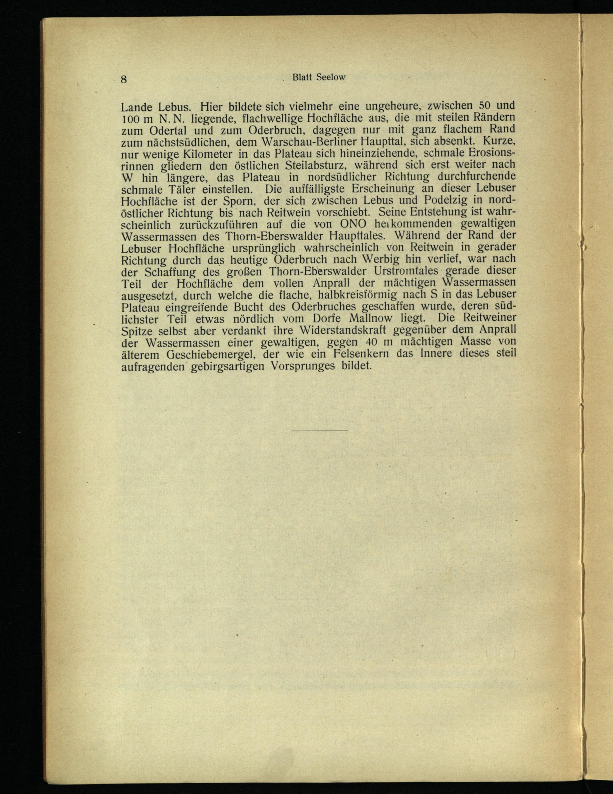 Lande Lebus . Hier bildete sich vielmehr eine ungeheure, zwischen 50 und 100 m N.N. liegende, flachwellige Hochfläche aus, die mit steilen Rändern zum Odertal und zum Oderbruch , dagegen nur mit ganz flachem Rand zum nächstsüdlichen, dem Warschau -Berliner Haupttal, sich absenkt. Kurze, nur wenige Kilometer in das Plateau sich hineinziehende, schmale Erosionsrinnen gliedern den östlichen Steilabsturz, während sich erst weiter nach W hin längere, das Plateau in nordsüdlicher Richtung durchfurchende schmale Täler einstellen. Die auffälligste Erscheinung an dieser Lebuser Hochfläche ist der Sporn, der sich zwischen Lebus und Podelzig in nordöstlicher Richtung bis nach Reitwein vorschiebt. Seine Entstehung ist wahrscheinlich zurückzuführen auf die von ONO heiıkommenden gewaltigen Wassermassen des Thorn-Eberswalder Haupttales. Während der Ränd der Lebuser Hochfläche ursprünglich wahrscheinlich: von Reitwein in gerader Richtung durch das heutige Oderbruch nach Werbig hin verlief, war nach der Schaffung des großen Thorn-Eberswalder Urstromtales gerade dieser Teil der Hochfläche dem vollen Anprall der mächtigen Wassermassen ausgesetzt, durch welche die flache, halbkreisförmig nach S in das Lebuser Plateau eingreifende Bucht des Oderbruches geschaffen wurde, deren südlichster Teil etwas nördlich vom Dorfe Mallnow liegt. Die Reitweiner Spitze selbst aber verdankt ihre Widerstandskraft gegenüber dem Anprall der Wassermassen einer gewaltigen, gegen 40 m mächtigen Masse von älterem Geschiebemergel, der wie ein Felsenkern das Innere dieses steil aufragenden gebirgsartigen Vorsprunges bildet.