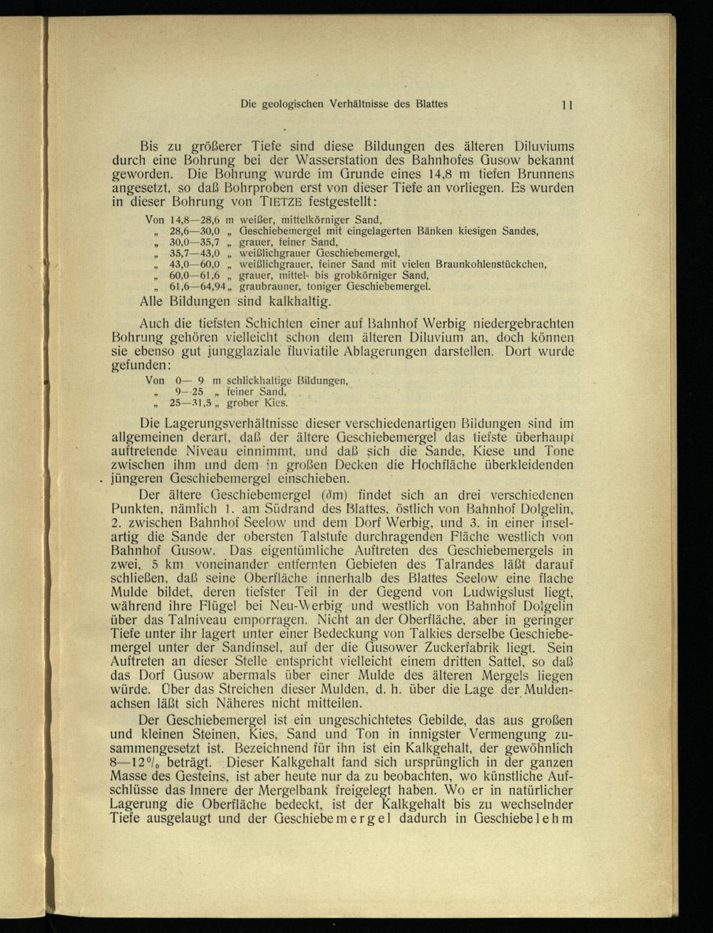Der ältere Geschiebemergel(dm) findet sich an drei verschiedenen Punkten, nämlich 1. am Südrand des Blattes, östlich von Bahnhof Dolgelin, 2. zwischen Bahnhof Seelow und‘ dem Dorf Werbig, und 3. in einer inselartig die Sande der ‚obersten Talstufe durchragenden Fläche westlich von Bahnhof Gusow. Das eigentümliche Auftreten des Geschiebemergels in zwei, 5 km voneinander ‚entfernten Gebieten des Talrandes läßt darauf schließen, daß seine Oberfläche innerhalb des Blattes Seelow eine flache Mulde bildet, deren tiefster Teil in der Gegend von Ludwigslust liegt, während ihre Flügel bei Neu-Werbig ‚und westlich von Bahnhof Dolgelin über das Talniveau emporragen. Nicht an der Oberfläche, aber in geringer Tiefe unter ihr lagert unter einer Bedeckung von Talkies derselbe Geschiebemergel unter der Sandinsel, auf der die Gusower Zuckerfabrik liegt. Sein Auftreten an dieser Stelle. entspricht vielleicht einem dritten Sattel, so daß das Dorf Gusow abermals über einer Mulde des älteren Mergels liegen würde. Über das Streichen dieser Mulden, d.h. über die Lage der Muldenachsen läßt sich Näheres nicht mitteilen.