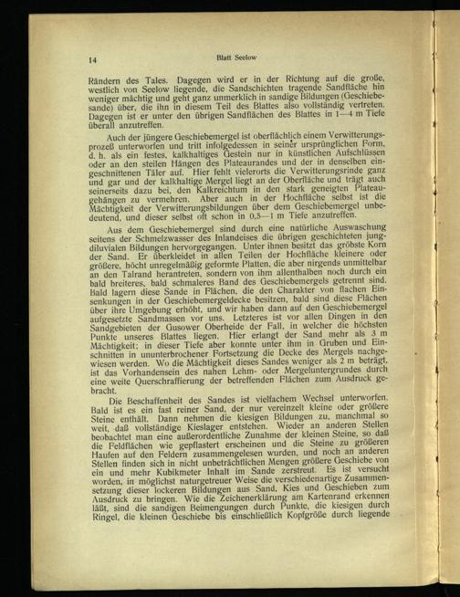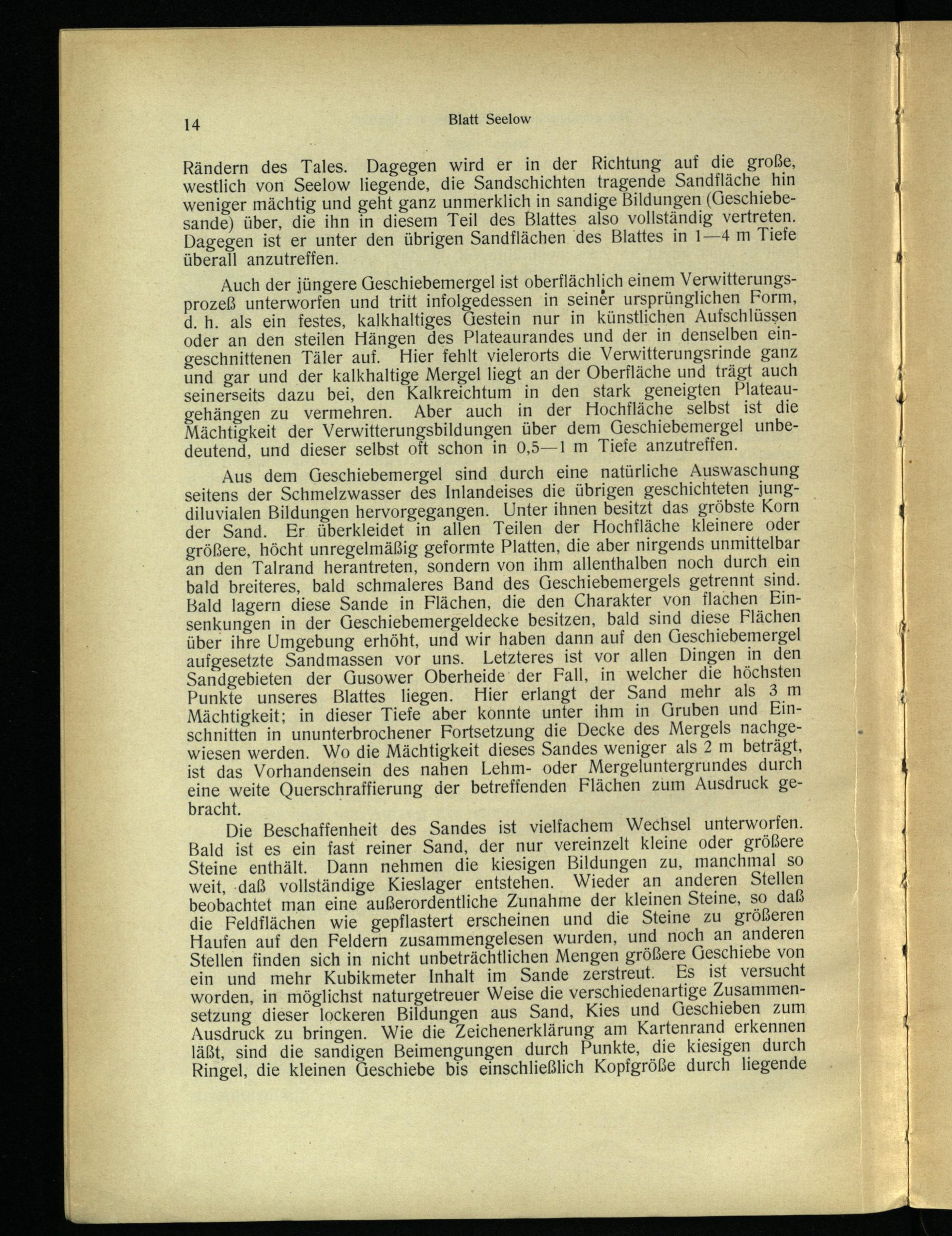 Rändern des Tales . Dagegen wird er in der Richtung auf die große; westlich von Seelow liegende, die Sandschichten tragende Sandfläche hin weniger mächtig und geht ganz unmerklich in sandige Bildungen(Geschiebesande) über, die ihn in diesem Teil des Blattes also vollständig vertreten. Dagegen ist er unter den übrigen Sandflächen des Blattes in 1—4 m Tiefe überall anzutreffen.