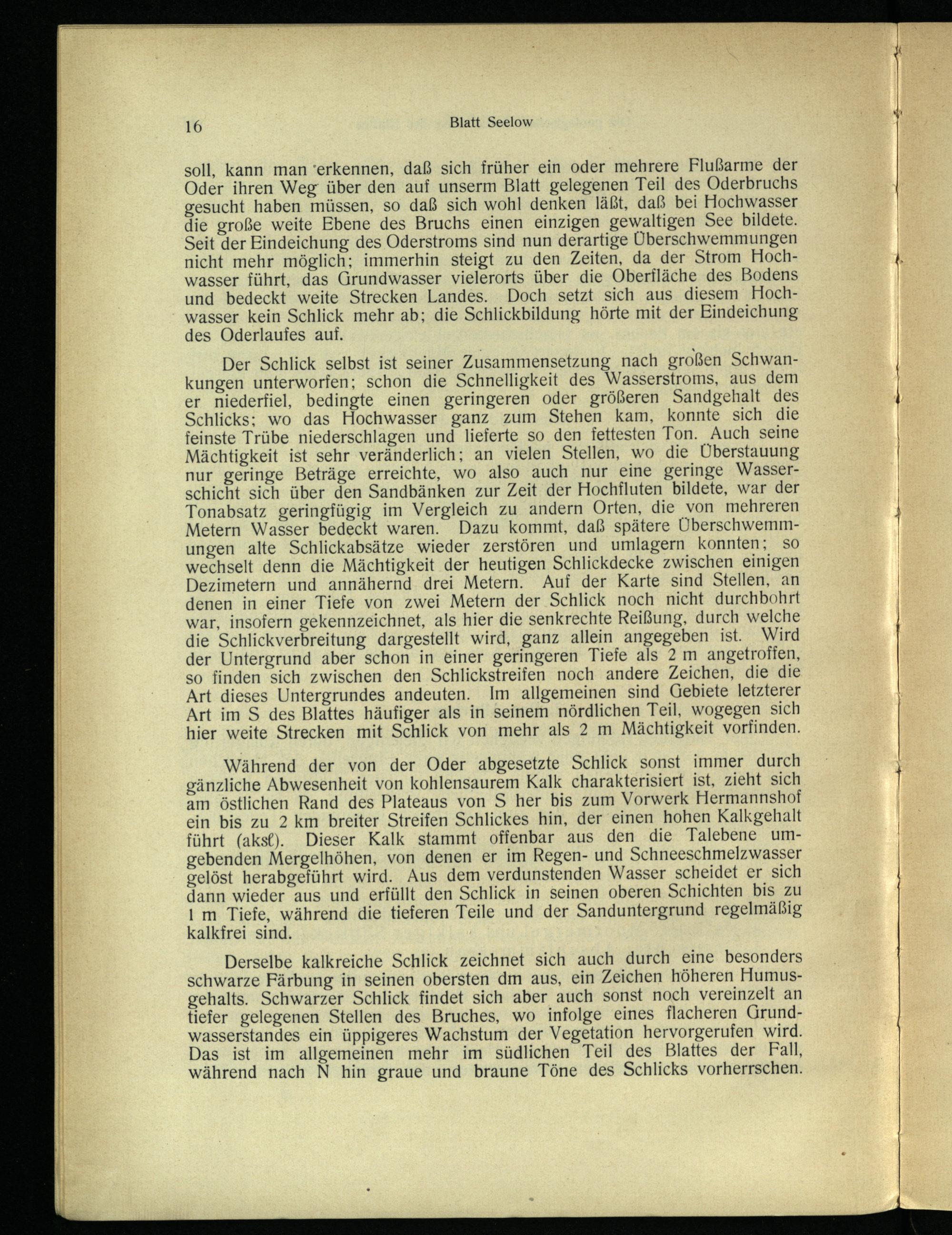 soll, kann man’erkennen, daß sich früher ein oder mehrere Flußarme der Oder ihren Weg über den auf unserm Blatt gelegenen Teil des Oderbruchs gesucht haben müssen, so daß sich wohl denken läßt, daß bei Hochwasser die große weite Ebene des Bruchs einen einzigen gewaltigen See bildete. Seit der Eindeichung des Oderstroms sind nun derartige Überschwemmungen nicht mehr möglich; immerhin steigt zu den Zeiten, da der Strom Hochwasser führt, das Grundwasser vielerorts über die Oberfläche des Bodens und bedeckt weite Strecken Landes. Doch setzt sich aus diesem Hochwasser kein Schlick mehr ab; die Schlickbildung hörte mit der Eindeichung des Oderlaufes auf.