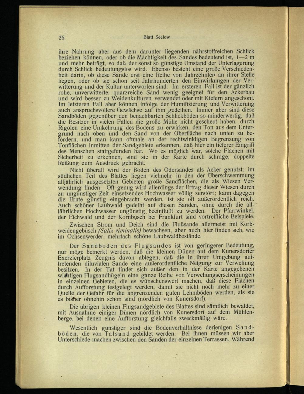 Nicht überall wird der Boden des Odersandes als Acker genutzt; im südlichen Teil des Blattes liegen vielmehr in den der Überschwemmung alljährlich ausgesetzten Gebieten große Sandflächen, die als Wiesen Verwendung finden. Oft genug wird allerdings der Ertrag dieser Wiesen durch zu ungünstiger Zeit einsetzendes Hochwasser völlig zerstört; kann dagegen die Ernte günstig eingebracht werden, ist sie oft außerordentlich reich. Auch schöner Laubwald gedeiht auf diesen Sanden, ohne durch die alljährlichen Hochwasser ungünstig beeinflußt zu werden. Der Pfarrwinkel, der Eichwald und der Kornbusch bei Frankfurt sind vortreffliche Beispiele.
