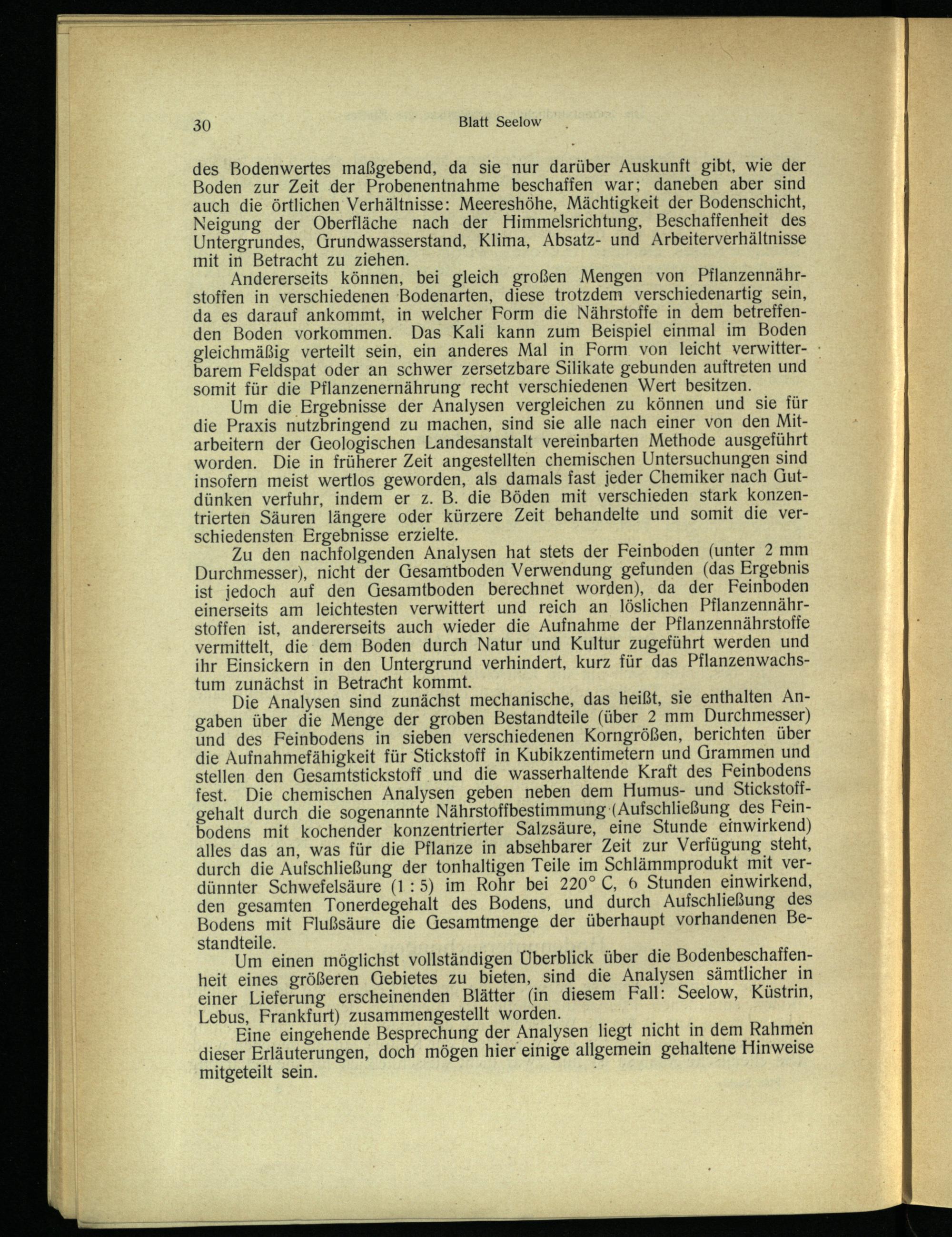 Um einen möglichst vollständigen Überblick über die Bodenbeschaffenheit eines größeren Gebietes zu bieten, sind die Analysen sämtlicher in einer Lieferung erscheinenden Blätter(in diesem Fall: Seelow , Küstrin , Lebus , Frankfurt ) zusammengestellt worden.