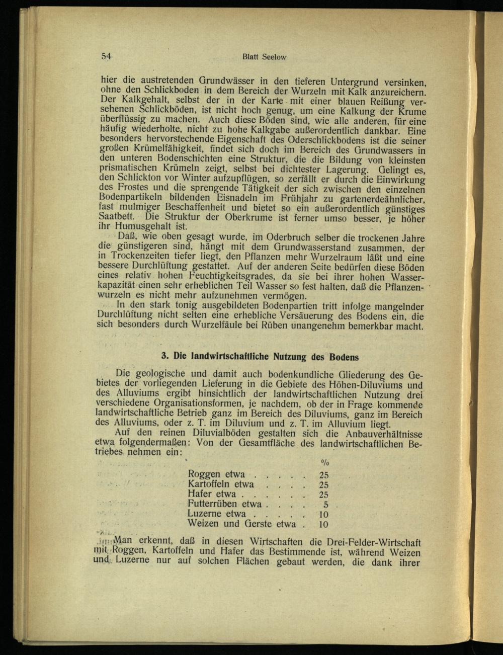 hier die austretenden Grundwässer in den tieferen Untergrund versinken, ohne den Schlickboden in dem Bereich der Wurzeln mit. Kalk anzureichern. Der Kalkgehalt, selbst der in der Karte.mit einer blauen Reißung versehenen Schlickböden, ist nicht hoch genug, um eine Kalkung der Krume überflüssig. zu machen. Auch diese Böden sind, wie alle anderen, für eine häufig wiederholte, nicht zu hohe Kalkgabe außerordentlich dankbar. Eine besonders hervorstechende Eigenschaft des Oderschlickbodens ist die seiner großen Krümelfähigkeit, findet sich doch im Bereich des Grundwassers in den unteren Bodenschichten eine Struktur, die die Bildung von kleinsten prismatischen Krümeln zeigt, selbst bei dichtester Lagerung. Gelingt es, den Schlickton vor Winter aufzupflügen, so zerfällt er durch die Einwirkung des Frostes und die sprengende Tätigkeit der sich zwischen den einzelnen Bodenpartikeln bildenden Eisnadeln im Frühjahr zu gartenerdeähnlicher, fast mulmiger Beschaffenheit und bietet so ein außerordentlich günstiges Saatbett. Die Struktur der Oberkrume ist ferner umso besser, je höher ihr Humusgehalt ist.