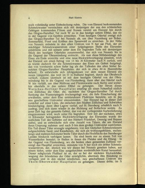 noch vollständig unter Eisbedeckung ruhte. Die vom Eisrand herkommenden Schmelzwasser vermischten sich mit denjenigen der aus den schlesischen Gebirgen kommenden Flüsse und flossen vereint am Eisrand hin durch das Glogau -Baruther Tal nach W zu in das heutige untere Elbtal, das sie in der Gegend von Genthin erreichten. Vom heutigen Odertal zweigt sich das Glogau -Baruther Tal bei Neusalz ab, um über Naumburg am Bober, Sommerfeld, Forst und Kottbus den Spreewald zu erreichen. In der Nähe von Neusalz mündete in den alten Urstrom von N her ein Fluß, der als mächtiger Schmelzwasserstrom einer tiefgelegenen Stelle des Eisrandes entströmte und mit seinem unter dem Eis liegenden Teile mit demjenigen Stück des heutigen Odertales zusammenfiel, das sich von Neusalz bis in die Gegend der Obramündung erstreckt. Als nun diese Stillstandslage des Eises ein Ende erreichte und eine neue Rückwärtsverlegung einsetzte, wich der Bisrand um einen Betrag von 15 bis 30 Kilometer nach N zurück, und es wurde dadurch für die Schmelzwasser des Eises ein Gebiet freigelegt, das von vornherein schon tiefer lag als der Talboden des alten bisher benutzten Glogau -Baruther Haupttales, der sich in etwa 80 m Meereshöhe befand. Es entwickelte sich infolgedessen vor dem neuen Eisrand ein neues Längental, das weit im O in Rußland beginnt, durch das Obrabruch verläuft, sodann identisch ist mit dem heutigen Odertal von der Obramündung bis in die Gegend von Fürstenberg, dann aber das Odertal nach W hin verläßt, um über Müllrose und Fürstenwalde nach Berlin und weiterhin ebenfalls in das untere Elbtal zu gelangen. Der Strom dieses Warschau -Berliner Haupttales empfing als einen Nebenfluß südlich von Züllichau die Oder, die, nachdem das Glogau -Baruther Tal durch Senkung des Wasserspiegels trockengelegt war, die tiefe Einschartung der erwähnten, unter dem Eise entstandenen Flußrinne benutzte, um in das neu geschaffene Urstromtal einzumünden. Der Eisrand lag in dieser Zeit zunächst auf einer Linie, die zwischen den Städten Züllichau und Schwiebus hindurchging, dann über Lagow verlief, auf Bl. Sternberg erheblich nach N ausbog, und sich dann wieder in der Richtung auf Bottschow senkte. Zu jener Zeit lag das gesamte Gebiet, das von der vorliegenden Kartenlieferung eingenommen wird, noch unter Eis begraben. Erst mit der nächsten, etwa 10 Kilometer betragenden Rückwärtsverlegung des Eisrandes wurde der südlichste Teil des Gebietes auf den Blättern Frankfurt , Drenzig und Reppen eisfrei, und es entwickelte sich eine Anzahl von Tälern, die am Eisrand ihren Ursprung nahmen und nach S hin dem großen Urstromtal zuströmten, Ein Teil dieser Täler erzeugte ungeheure, von den Gletscher-Schmelzwässern aufgeschüttete Sand- und Kiesebenen, die sich als wohlausgebildete, meilenlange und mehrere Kilometer breite Täler durch die Hochfläche des Sternberger Landes hindurch verfolgen lassen. Sie sind heute nur zu einem Teil von Wasserläufen benutzt; es fließen in ihnen die Pleiske und die Eilang. In der Gegend von Fürstenberg, wo die beiden oben genannten Zuflüsse vereinigt das Haupttal erreichten, mündete von N her noch ein dritter Schmelzwasserstrom, der, ähnlich wie wir dieses bei Neusalz gesehen haben, aus einem tiefen, unter dem Eise ausgefurchten nordsüdlichen Kanal heraustrat. Dieser subglaziale Flußlauf ist es, der es bei der nächsten Rückwärtsbewegung des Inlandeises‘ der Oder ermöglichte, abermals ihre Mündung zu verlegen und in den nächst nördlichen, neu geschaffenen Urstrom des Thorn-Eberswalder Haupttales zu gelangen. Dieses dritte, im N