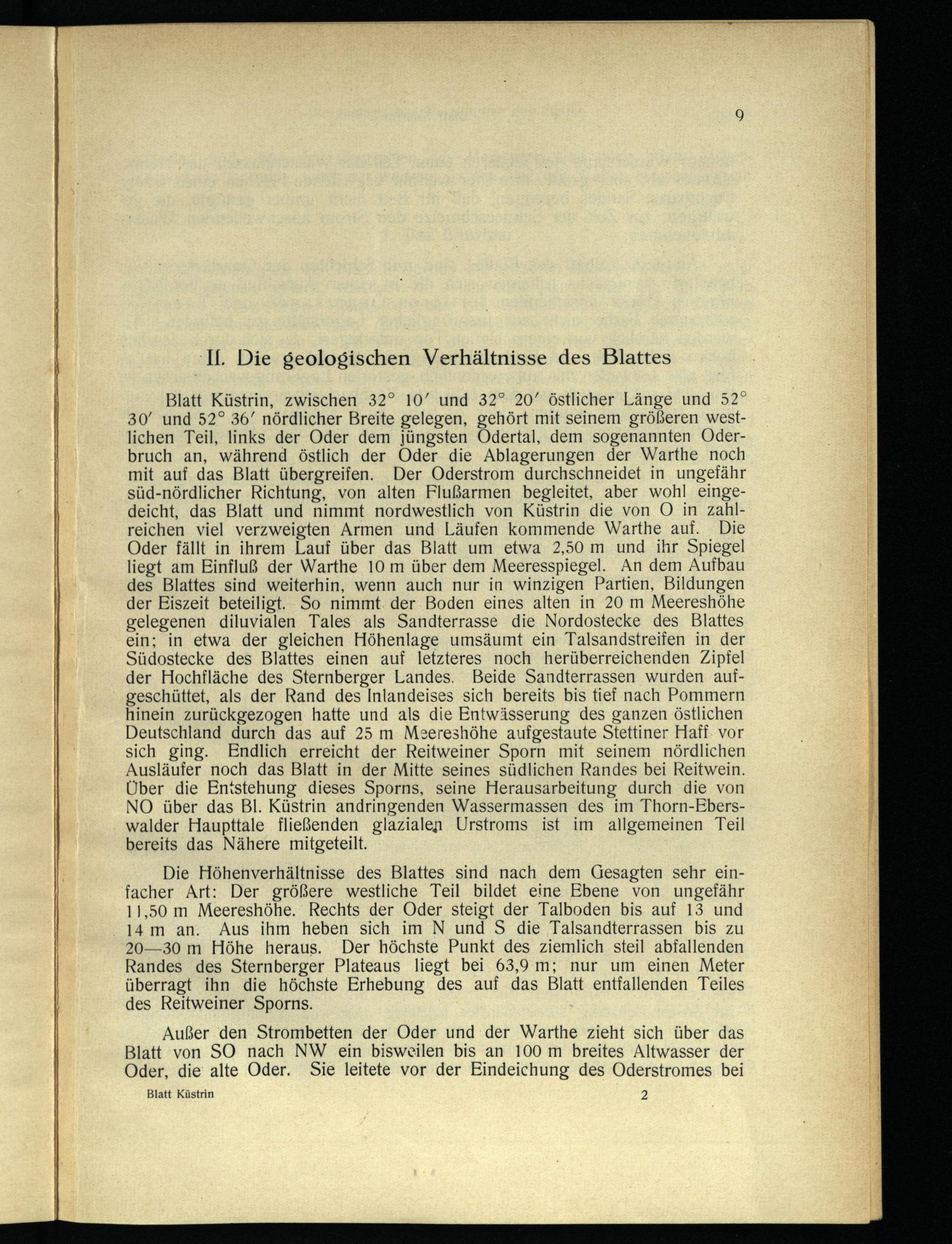 Blatt Küstrin, zwischen 32° 10’ und 32° 20’ östlicher Länge und 52° 30’ und 52° 36’ nördlicher Breite gelegen, gehört mit seinem größeren westlichen Teil, links der Oder dem jüngsten Odertal, dem sogenannten OÖderbruch an, während östlich der Oder die Ablagerungen der Warthe noch mit auf das Blatt übergreifen. Der Oderstrom durchschneidet in ungefähr süd-nördlicher Richtung, von alten Flußarmen begleitet, aber wohl eingedeicht, das Blatt und nimmt nordwestlich von Küstrin die von O in zahlreichen viel verzweigten Armen und Läufen kommende Warthe auf. Die Oder fällt in ihrem Lauf über das Blatt um etwa 2,50 m und ihr Spiegel liegt am Einfluß der Warthe 10 m über dem Meeresspiegel. An dem Aufbau des Blattes sind weiterhin, wenn auch nur in winzigen Partien, Bildungen der Eiszeit beteiligt. So nimmt. der Boden eines alten in 20 m Meereshöhe gelegenen diluvialen Tales als Sandterrasse die Nordostecke des Blattes ein; in etwa der gleichen Höhenlage umsäumt ein Talsandstreifen in der Südostecke des Blattes einen auf letzteres noch herüberreichenden Zipfel der Hochfläche des Sternberger Landes. Beide Sandterrassen wurden aufgeschüttet, als der Rand des Inlandeises sich bereits bis tief nach Pommern hinein zurückgezogen hatte und als die Entwässerung des ganzen östlichen Deutschland durch das auf 25 m Meereshöhe aufgestaute Stettiner Haff . vor sich ging. Endlich erreicht der Reitweiner Sporn mit seinem nördlichen Ausläufer noch das Blatt in der Mitte seines südlichen Randes bei Reitwein . Über die Entstehung dieses Sporns, seine Herausarbeitung durch die von NO über das Bl. Küstrin andringenden Wassermassen des im Thorn-Eberswalder Haupttale fließenden glazialen Urstroms ist im allgemeinen Teil bereits das Nähere mitgeteilt.