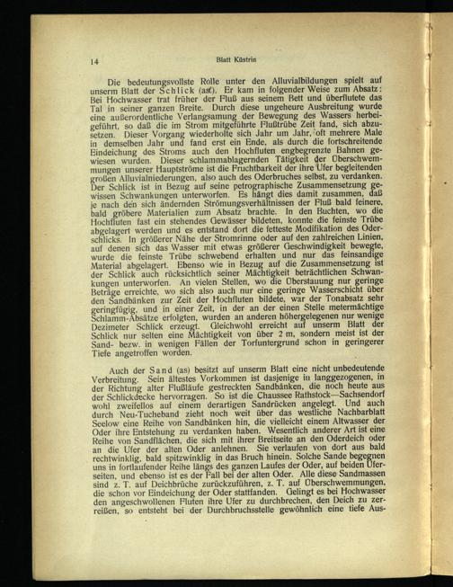 Auch der Sand(as) besitzt auf unserm Blatt eine nicht unbedeutende Verbreitung. Sein ältestes Vorkommen ist dasjenige in langgezogenen, in der Richtung alter Flußläufe gestreckten Sandbänken, die noch heute aus der Schlickdecke hervorragen. So ist die Chaussee Rathstock—Sachsendorf wohl zweifellos auf einem derartigen Sandrücken angelegt. Und auch durch Neu-Tucheband zieht noch weit über das westliche Nachbarblatt Seelow eine Reihe von Sandbänken hin, die vielleicht einem Altwasser der Oder ihre Entstehung zu verdanken haben. Wesentlich anderer Art ist eine Reihe von Sandflächen, die sich mit ihrer Breitseite an den Oderdeich oder an die Ufer der alten Oder anlehnen. Sie verlaufen von dort aus bald rechtwinklig, bald spitzwinklig in das Bruch hinein. Solche Sande begegnen uns in fortlaufender Reihe längs des ganzen Laufes der Oder, auf beiden Uferseiten, und ebenso ist es der Fall bei der alten Oder. Alle diese Sandmassen sind z. T. auf Deichbrüche zurückzuführen, z. T. auf Überschwemmungen, die schon vor Eindeichung der Oder stattfanden. Gelingt es bei Hochwasser den angeschwollenen Fluten ihre Ufer zu durchbrechen, den Deich zu zerreißen, so entsteht bei der Durchbruchsstelle gewöhnlich eine tiefe Aus