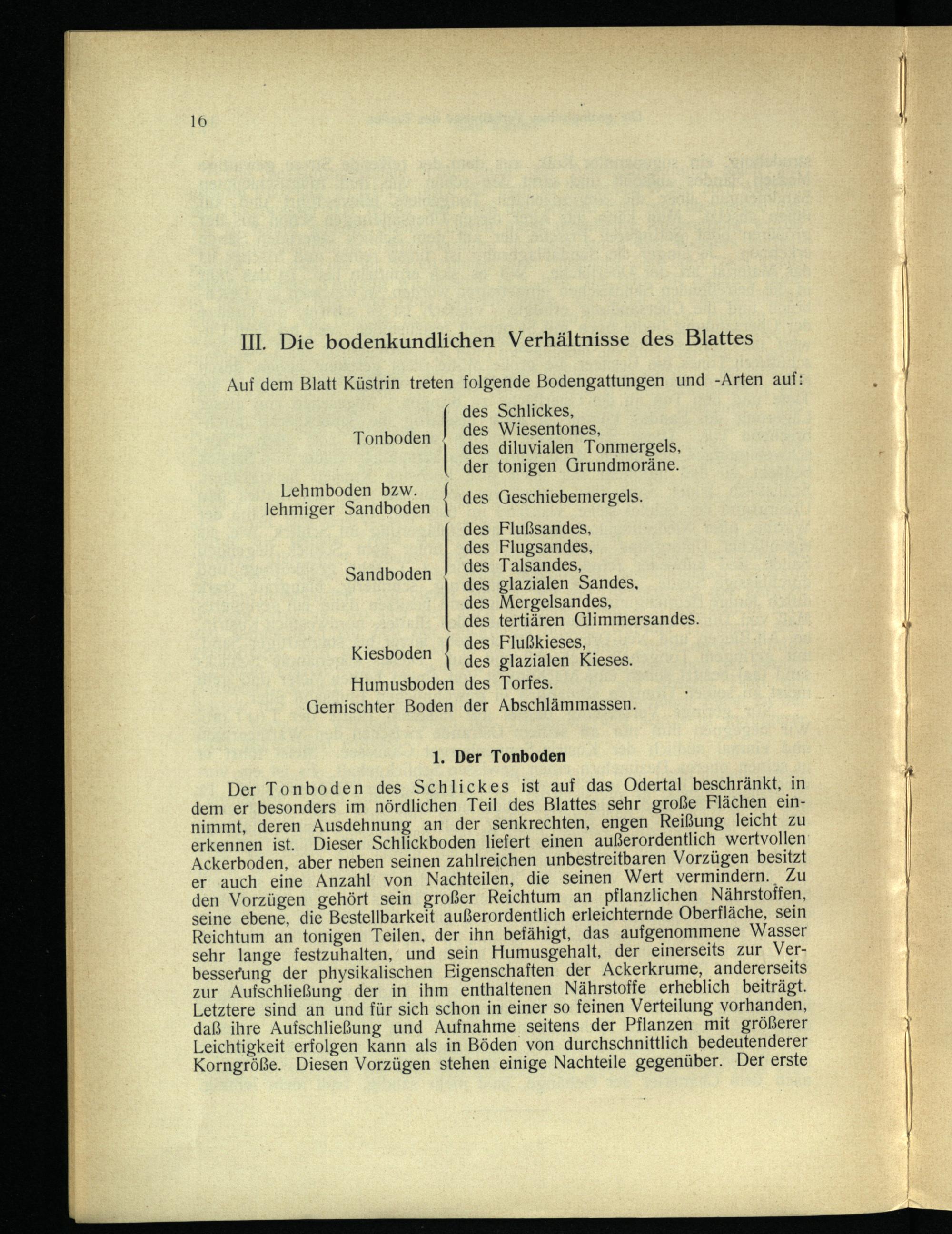 Der Tonboden des Schlickes ist auf das Odertal beschränkt, in dem er besonders im nördlichen Teil des Blattes sehr große Flächen einnimmt, deren Ausdehnung an der senkrechten, engen Reißung leicht zu erkennen ist. Dieser Schlickboden liefert einen außerordentlich wertvollen Ackerboden, aber neben seinen zahlreichen unbestreitbaren Vorzügen besitzt er auch eine Anzahl von Nachteilen, die seinen Wert vermindern. Zu den Vorzügen gehört sein großer Reichtum an pflanzlichen Nährstoffen, seine ebene, die Bestellbarkeit außerordentlich erleichternde Oberfläche, sein Reichtum an tonigen Teilen, der ihn befähigt, das aufgenommene Wasser sehr lange festzuhalten, und sein Humusgehalt, der einerseits zur Verbesserung der physikalischen Eigenschaften der Ackerkrume, andererseits zur Aufschließung der in ihm enthaltenen Nährstoffe erheblich beiträgt. Letztere sind an und für sich schon in einer so feinen Verteilung vorhanden, daß ihre Aufschließung und Aufnahme seitens der Pflanzen mit größerer Leichtigkeit erfolgen kann als in Böden von durchschnittlich bedeutenderer Korngröße. Diesen Vorzügen stehen einige Nachteile gegenüber. Der erste