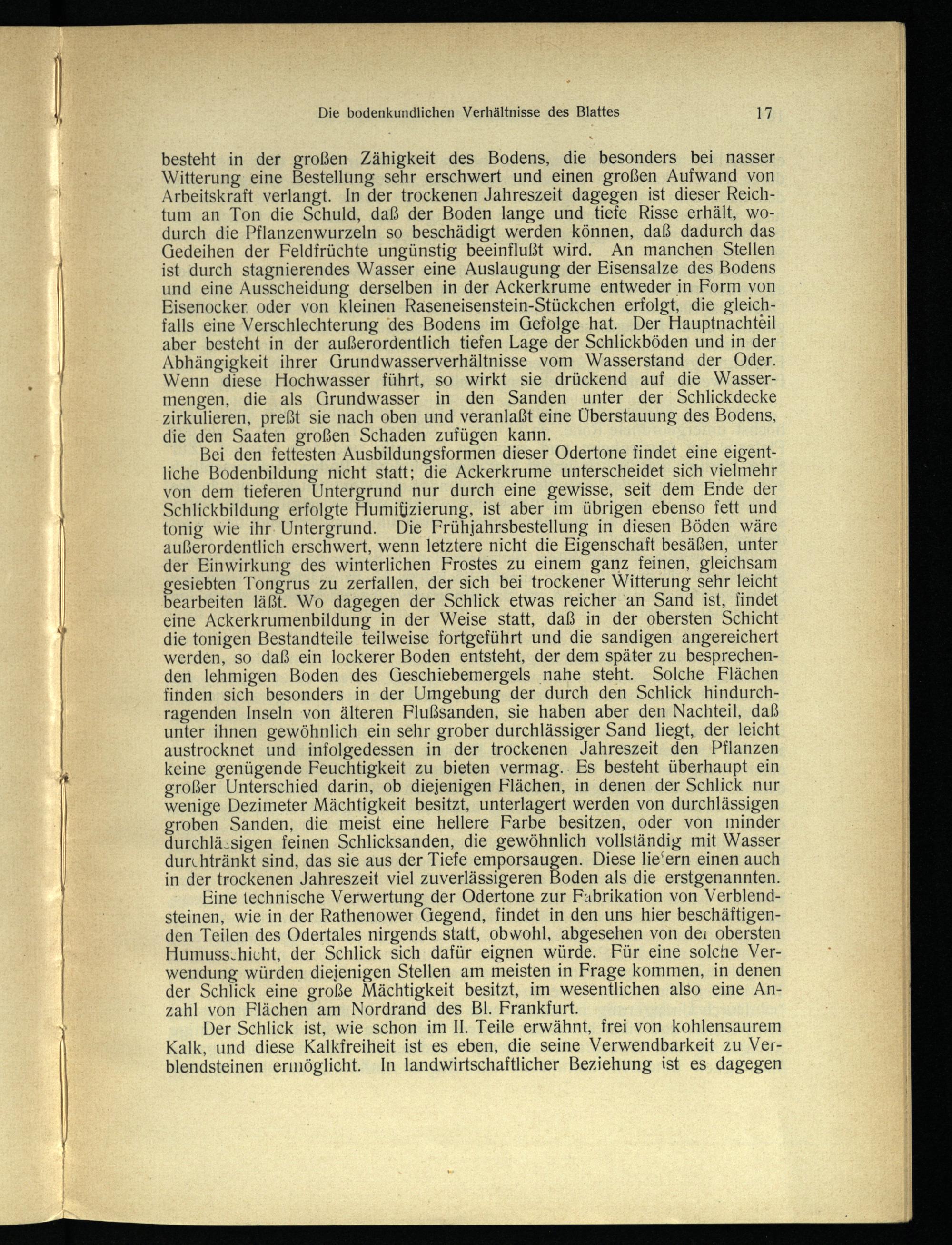 besteht in der großen Zähigkeit des Bodens, die besonders bei nasser Witterung: eine Bestellung sehr erschwert und einen großen Aufwand von Arbeitskraft verlangt. In der trockenen Jahreszeit dagegen ist dieser Reichtum an Ton die Schuld, daß der Boden lange und tiefe Risse erhält, wodurch die Pflanzenwurzeln so beschädigt werden können, daß dadurch das Gedeihen der Feldfirüchte ungünstig beeinflußt wird. An manchen Stellen ist durch stagnierendes Wasser eine Auslaugung der Eisensalze des Bodens und eine Ausscheidung derselben in der Ackerkrume entweder in Form von Eisenocker. oder von kleinen Raseneisenstein-Stückchen erfolgt, die gleichfalls eine Verschlechterung des Bodens im Gefolge hat. Der Hauptnachteil aber besteht in der außerordentlich tiefen Lage der Schlickböden und in der Abhängigkeit ihrer Grundwasserverhältnisse vom Wasserstand der Oder. Wenn diese Hochwasser führt, so wirkt sie drückend auf die Wassermengen, die als Grundwasser in den Sanden unter der Schlickdecke zirkulieren, preßt sie nach oben und veranlaßt eine Überstauung des Bodens, die den Saaten großen Schaden zufügen kann.