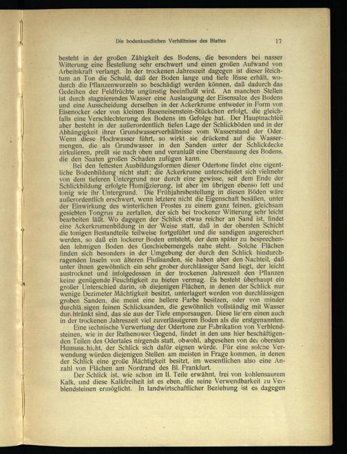 Eine technische Verwertung der Odertone zur Fubrikation von Verblendsteinen, wie in der Rathenower Gegend, findet in den uns hier beschäftigenden Teilen des Odertales nirgends statt, obwohl, abgesehen von der obersten Humusschicht, der Schlick sich dafür eignen würde. Für eine solche Verwendung würden diejenigen Stellen am meisten in Frage kommen, in denen der Schlick eine große Mächtigkeit besitzt, im wesentlichen also eine Anzahl von Flächen am Nordrand des Bl. Frankfurt.