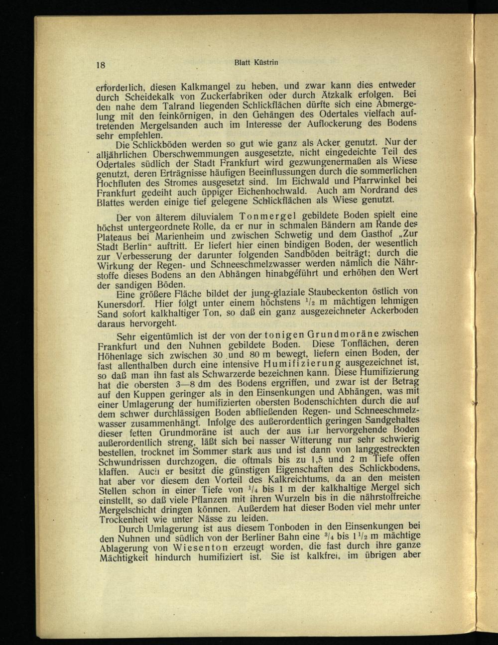 Eine größere Fläche bildet der jung-glaziale Staubeckenton östlich von Kunersdorf. Hier folgt unter einem höchstens!/2z m mächtigen lehmigen Sand sofort kalkhaltiger Ton, so daß ein ganz ausgezeichneter Ackerboden daraus hervorgeht.