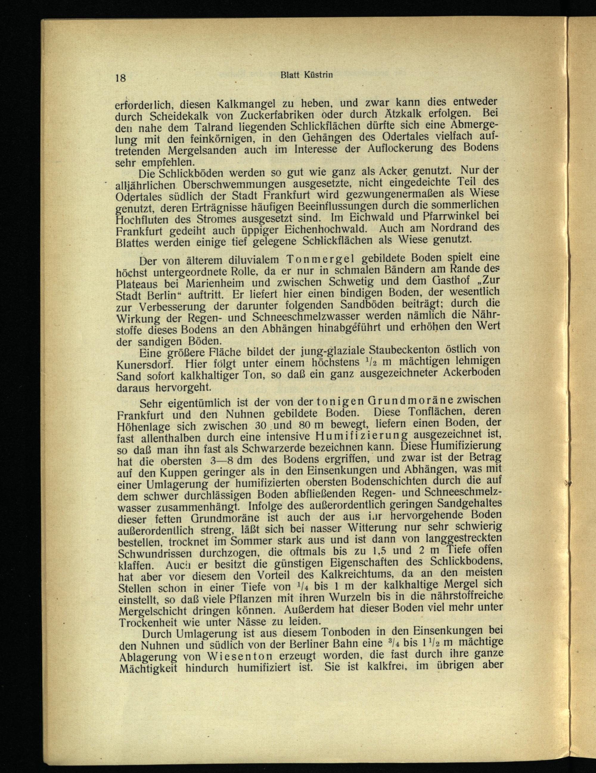 Sehr eigentümlich ist der von der tonigen Grundmoräne zwischen Frankfurt und den Nuhnen gebildete Boden. Diese Tonflächen, deren Höhenlage sich zwischen 30 und 80 m bewegt, liefern einen Boden, der fast allenthalben durch eine intensive Humifizierung ausgezeichnet ist, so daß man ihn fast als Schwarzerde bezeichnen kann. Diese Humifizierung hat die obersten 3—8 dm des Bodens ergriffen, und zwar ist der Betrag auf den Kuppen geringer als in den Einsenkungen und Abhängen, was mit einer Umlagerung der humifizierten obersten Bodenschichten durch die auf dem schwer durchlässigen Boden abfließenden Regen- und Schneeschmelzwasser zusammenhängt. Infolge des außerordentlich geringen Sandgehaltes dieser fetten Grundmoräne ist auch der aus iur hervorgehende Boden außerordenllich streng, läßt sich bei nasser Witterung nur sehr schwierig bestellen, trocknet im Sommer stark aus und ist dann von langgestreckten Schwundrissen durchzogen, die oftmals bis zu 1,5 und 2 m Tiefe offen klaffen. Auch er besitzt die günstigen Eigenschaften des Schlickbodens, hat aber vor diesem den Vorteil des Kalkreichtums, da an den meisten Stellen schon in einer Tiefe von!/a« bis 1 m der kalkhaltige Mergel sich einstellt, so daß viele Pflanzen mit ihren Wurzeln bis in die nährstoffreiche Mergelschicht dringen können. Außerdem hat dieser Boden viel mehr unter Trockenheit wie unter Nässe zu leiden.