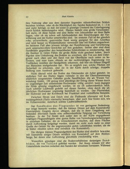 Nicht überall wird der Boden des Odersandes als Acker genutzt; im südlichen Teil des Blattes liegen vielmehr in‘ den der Überschwemmung alljährlich ausgesetzten Gebieten große Sandflächen, die als Wiesen Verwendung finden. Oft genug wird allerdings der Ertrag dieser Wiesen durch zu ungünstiger Zeit einsetzendes Hochwasser völlig zerstört; kann dagegen die Ernte günstig eingebracht werden, ist sie oft außerordentlich reich. Auch schöner Laubwald gedeiht auf diesen Sanden, ohne durch die alljährlichen Hochwasser ungünstig beeinflußt zu werden. Der Pfarrwinkel, der Eichwald und der Kornbusch bei Frankfurt sind vortreffliche Beispiele.
