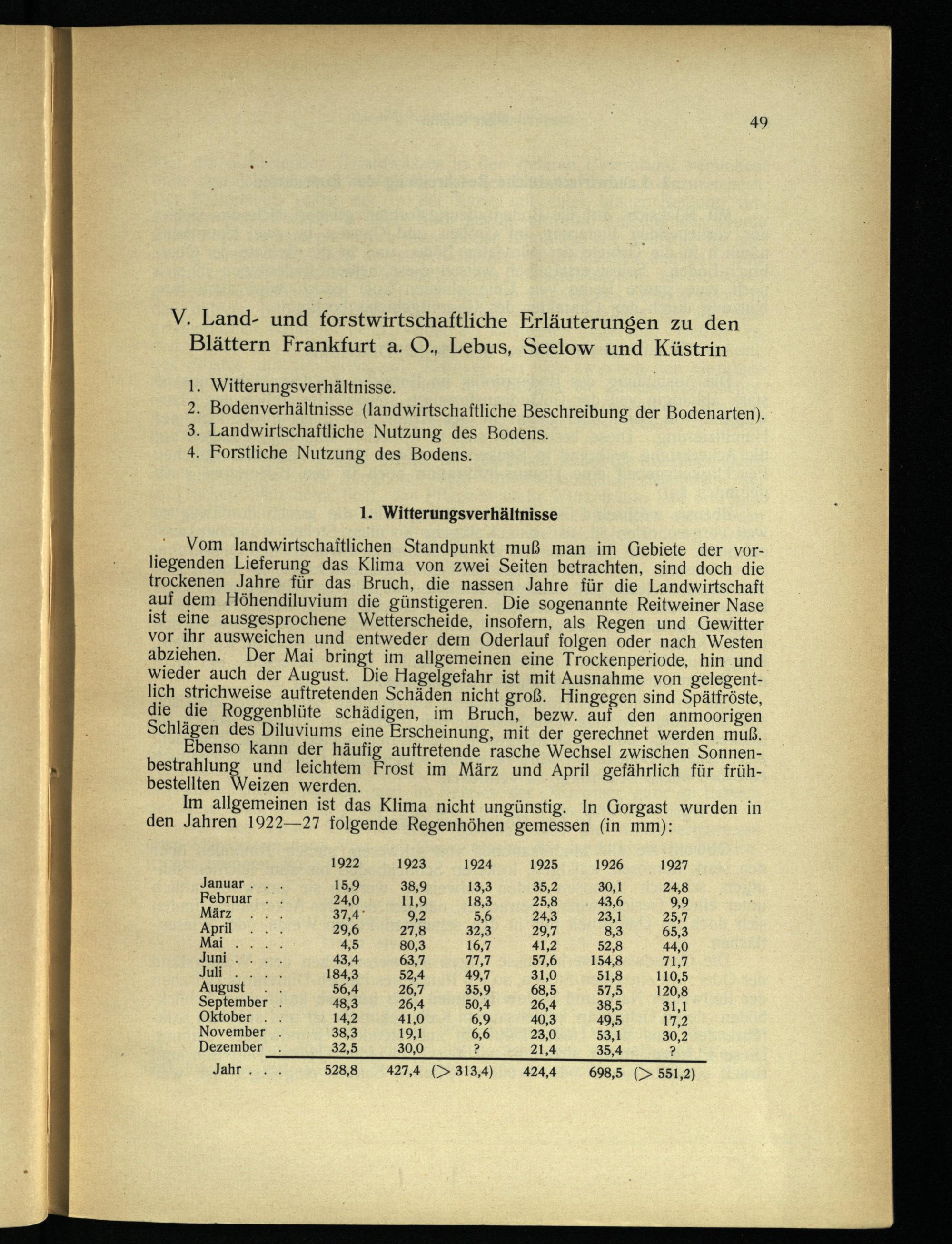 Vom landwirtschaftlichen Standpunkt muß man im Gebiete der vorliegenden Lieferung das Klima von zwei Seiten betrachten, sind doch die trockenen Jahre für das Bruch, die nassen Jahre für die Landwirtschaft auf dem Höhendiluvium die günstigeren. Die sogenannte Reitweiner Nase ist eine ausgesprochene Wetterscheide, insofern, als Regen und Gewitter vor ihr ausweichen und entweder dem Oderlauf folgen oder nach Westen abziehen. Der Mai bringt im allgemeinen eine Trockenperiode, hin ‚und wieder auch der August. Die Hagelgefahr ist mit Ausnahme von gelegentlich strichweise auftretenden Schäden nicht groß. Hingegen sind Spätfröste, die die Roggenblüte schädigen, im Bruch, bezw. auf den anmoorigen Schlägen des Diluviums eine Erscheinung, mit der gerechnet werden muß.