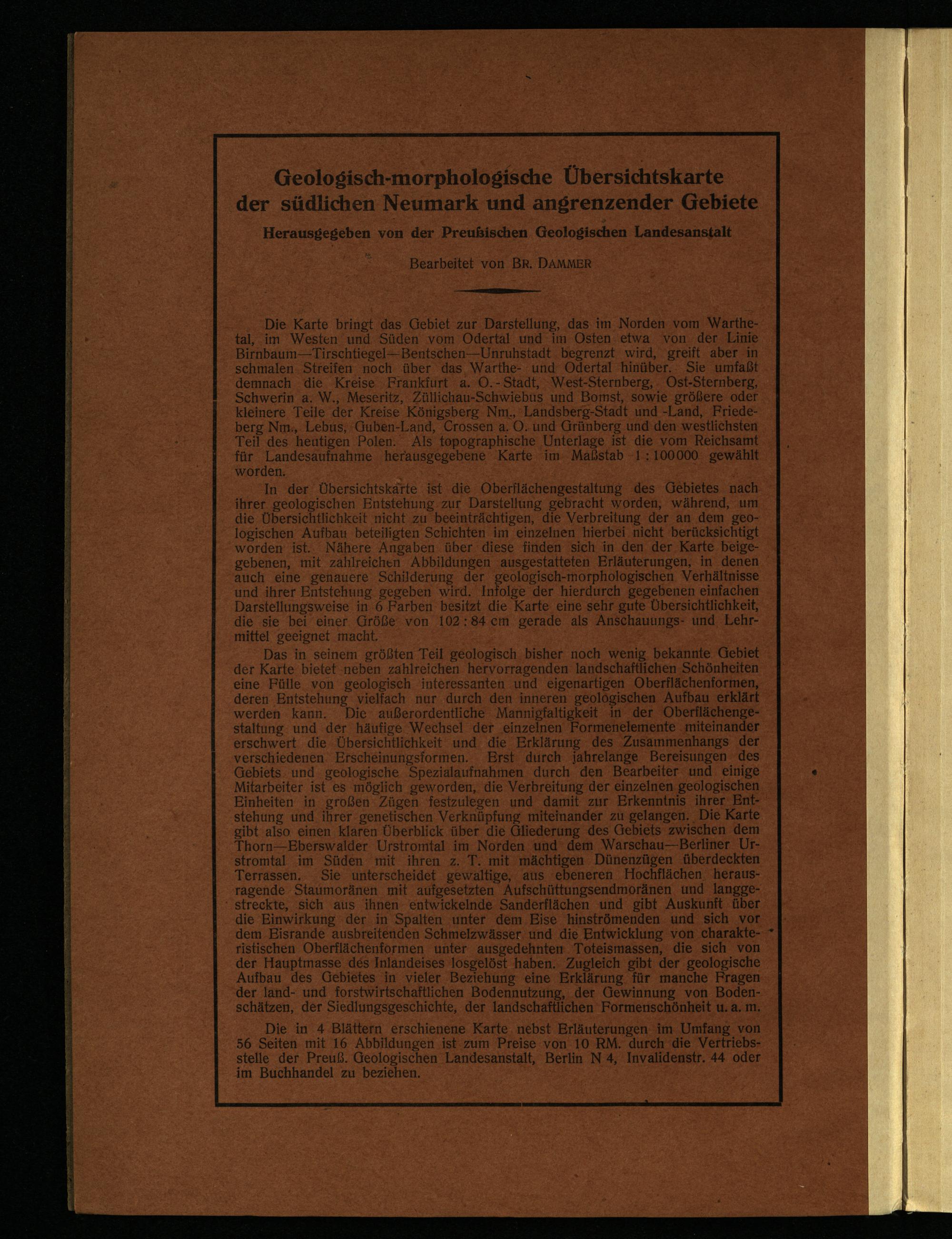 Das in seinem größten Teil geologisch bisher noch wenig. bekannte. Gebiet der Karte bietet neben zahlreichen. hervorragenden landschaftlichen Schönheiten eine. Fülle von geologisch interessanten und eigenartigen Oberflächenformen, deren Entstehung vielfach nur durch den inneren geologischen Aufbau erklärt werden kann. Die- außerordentliche Mannigfaltigkeit in der Oberflächengestaltung: und der häufige Wechsel der ‚einzelnen Formenelemente ‚miteinander erschwert. die. Übersichtlichkeit‘ und die Erklärung des Zusammenhangs der verschiedenen. Erscheinungsformen. Erst durch jahrelange Bereisungen des Gebiets. und. geologische. Spezialaufnahmen durch den Bearbeiter und einige Mitarbeiter. ist es möglich geworden, die Verbreitung der einzelnen geologischen Einheiten in großen‘ Zügen festzulegen und damit zur Erkenntnis ihrer Entstehung und. ihrer genetischen Verknüpfung miteinander zu gelangen. Die Karte gibt also einen klaren Überblick über die Gliederung des Gebiets zwischen dem Thorn—Eberswalder Urstromtal. im Norden. und’ dem Warschau—Berliner Urstromtal im Süden mit ihren z. T. mit mächtigen Dünenzügen überdeckten Terrassen. Sie unterscheidet gewaltige, aus ebeneren Hochflächen‘ herausragende Staumoränen mit aufgesetzten Aufschüttungsendmoränen und langge