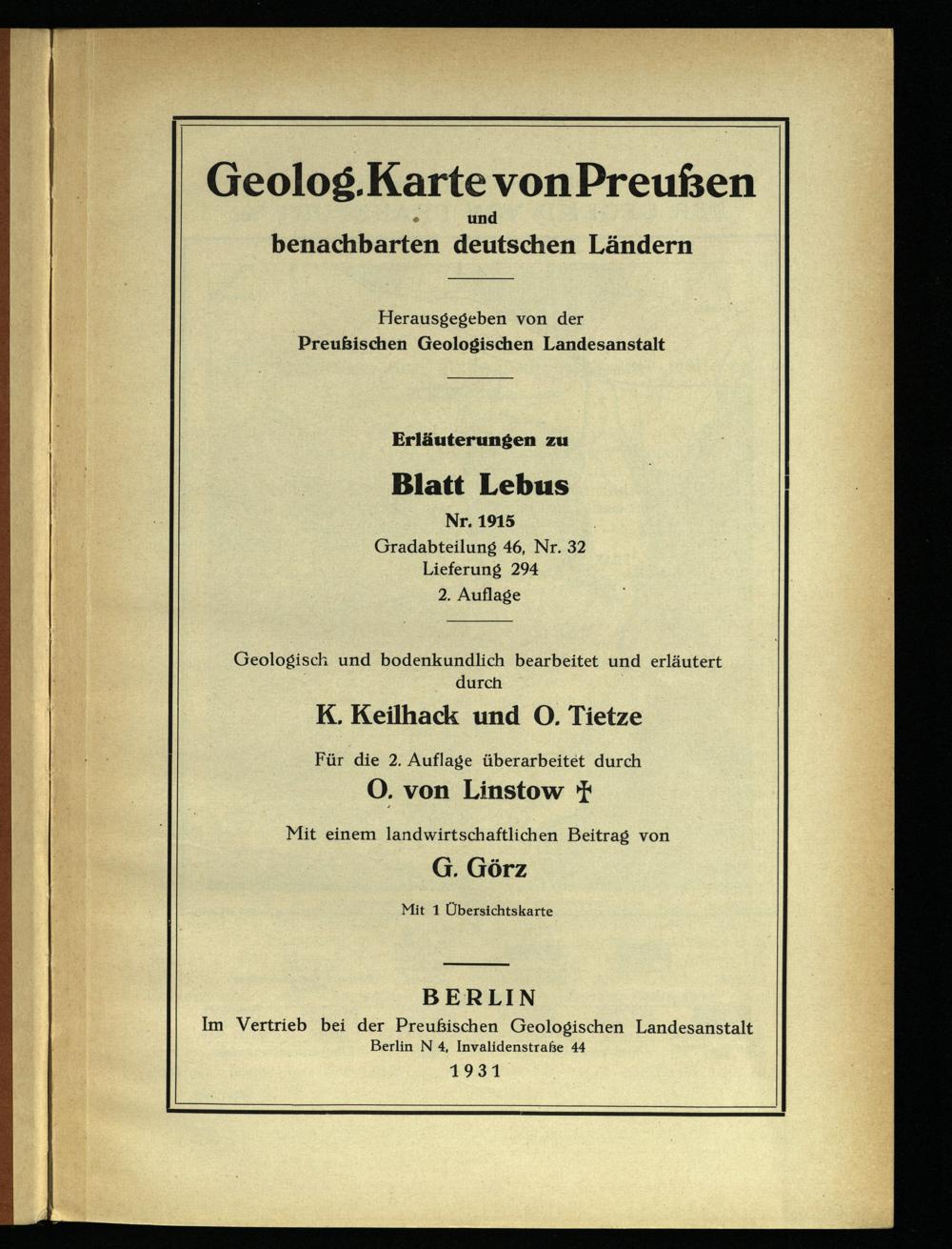 Im Vertrieb bei der Preußischen Geologischen Landesanstalt Berlin N 4, Invalidenstraße 44