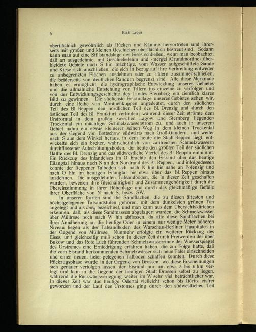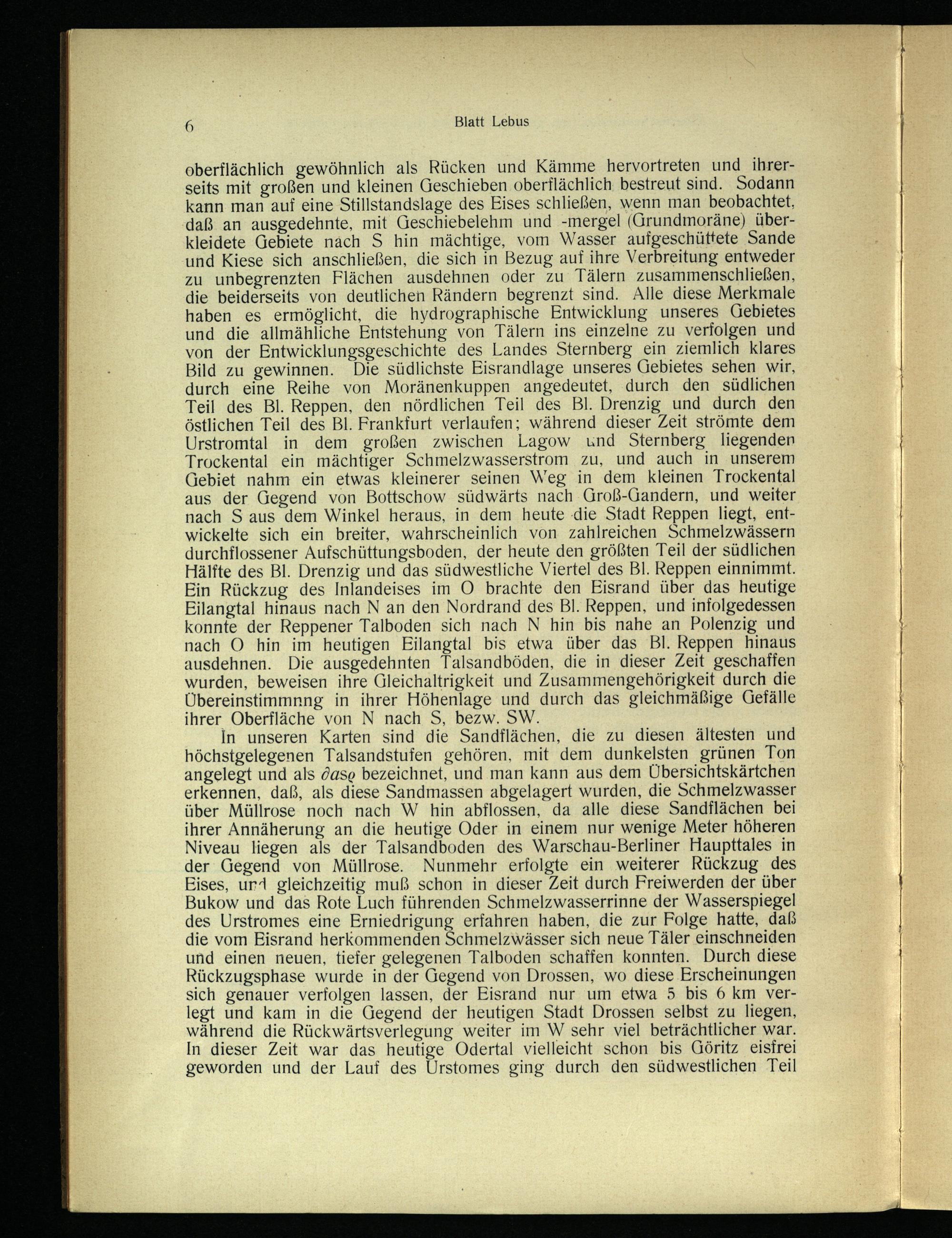 oberflächlich gewöhnlich als Rücken und Kämme hervortreten und ihrerseits mit großen und kleinen Geschieben oberflächlich. bestreut sind. Sodann kann man auf eine Stillstandslage des Eises schließen, wenn man beobachtet, daß an ausgedehnte, mit Geschiebelehm und-mergel(Grundmoräne) überkleidete Gebiete nach S hin mächtige, vom Wasser aufgeschüttete Sande und Kiese sich anschließen, die sich in Bezug auf ihre Verbreitung entweder zu unbegrenzten Flächen ausdehnen oder zu Tälern zusammenschließen, die beiderseits von deutlichen Rändern begrenzt sind. Alle diese Merkmale haben es ermöglicht, die hydrographische Entwicklung unseres Gebietes und die allmähliche Entstehung von Tälern ins einzelne zu verfolgen und von der Entwicklungsgeschichte des Landes Sternberg ein ziemlich klares Bild zu gewinnen. Die südlichste Eisrandlage unseres Gebietes sehen wir, durch eine Reihe von Moränenkuppen angedeutet, durch den südlichen Teil des Bl. Reppen, den nördlichen Teil des Bl. Drenzig und durch den östlichen Teil des Bl. Frankfurt verlaufen; während dieser Zeit strömte dem Urstromtal in dem großen zwischen Lagow und Sternberg liegenden Trockental ein mächtiger Schmelzwasserstrom zu, und auch in unserem Gebiet nahm ein etwas kleinerer seinen Weg in dem kleinen Trockental aus der Gegend von Bottschow südwärts nach Groß-Gandern, und weiter nach S aus dem Winkel heraus, in dem heute die Stadt Reppen liegt, entwickelte sich ein breiter, wahrscheinlich von zahlreichen Schmelzwässern durchflossener Aufschüttungsboden, der heute den größten Teil der südlichen Hälfte des Bl. Drenzig und das südwestliche Viertel des Bl. Reppen einnimmt. Ein Rückzug des Inlandeises im O brachte den Eisrand über das heutige Eilangtal hinaus nach N an den Nordrand des Bl. Reppen, und infolgedessen konnte der Reppener Talboden sich nach N hin bis nahe an Polenzig und nach O hin im heutigen Eilangtal bis etwa über das Bl. Reppen hinaus ausdehnen. Die ausgedehnten Talsandböden, die in dieser Zeit geschaffen wurden, beweisen ihre Gleichaltrigkeit und Zusammengehörigkeit durch die Übereinstimmnng in ihrer Höhenlage und durch das gleichmäßige Gefälle ihrer Oberfläche von N nach S, bezw. SW.