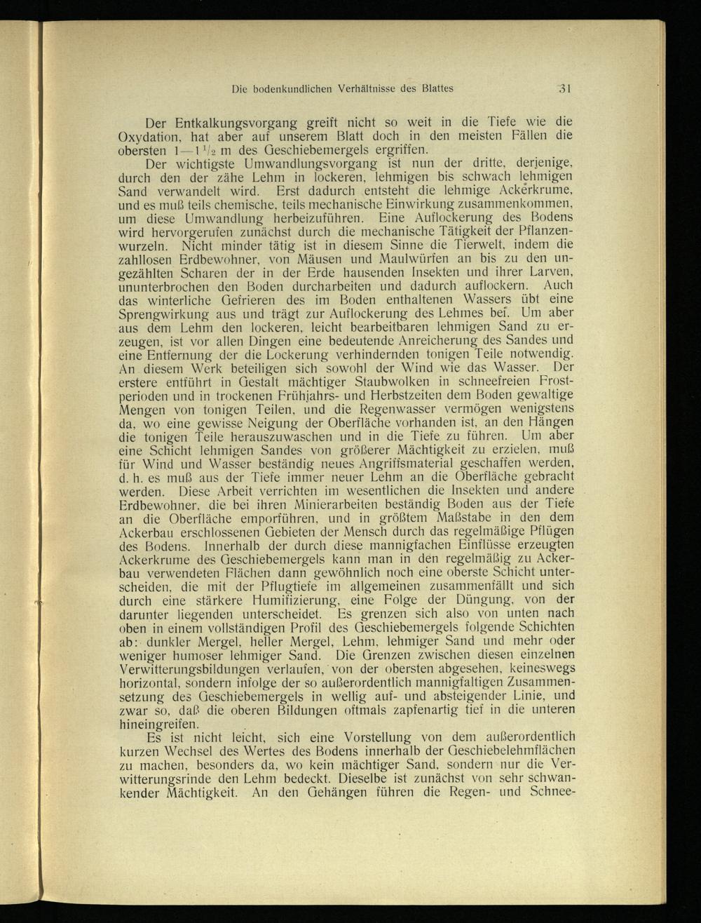 Der wichtigste Umwandlungsvorgang ist nun der dritte, derjenige, durch den der zähe Lehm in lockeren, lehmigen bis schwach lehmigen Sand verwandelt wird. Erst dadurch ‚entsteht die lehmige Ackerkrume, und es muß teils chemische, teils mechanische Einwirkung zusammenkommen, um diese Umwandlung herbeizuführen. Eine Auflockerung des Bodens wird hervorgerufen zunächst durch die mechanische Tätigkeit der Pflanzenwurzeln. Nicht minder tätig ist in diesem Sinne die Tierwelt, indem die zahllosen Erdbewohner, von Mäusen und Maulwürfen an bis zu den ungezählten Scharen der in der Erde hausenden Insekten und ihrer Larven, ununterbrochen den Boden durcharbeiten und dadurch auflockern. Auch das winterliche Gefrieren des im Boden enthaltenen Wassers übt eine Sprengwirkung aus und trägt zur Auflockerung des Lehmes bei. Um aber aus dem Lehm den lockeren, leicht bearbeitbaren lehmigen Sand zu erzeugen, ist vor allen Dingen eine bedeutende Anreicherung des Sandes und eine Entfernung der die Lockerung verhindernden tonigen Teile notwendig. An. diesem Werk beteiligen sich sowohl der Wind wie das Wasser. Der erstere entführt in Gestalt mächtiger Staubwolken in schneefreien Frostperioden und in trockenen Frühjahrs- und Herbstzeiten dem Boden gewaltige Mengen von tonigen Teilen, und die Regenwasser vermögen wenigstens da, wo eine gewisse Neigung der Oberfläche vorhanden ist, an den Hängen die tonigen Teile herauszuwaschen und in die Tiefe zu führen. Um aber eine Schicht lehmigen Sandes von größerer Mächtigkeit zu erzielen, muß für Wind und Wasser beständig neues Angriffsmaterial geschaffen werden, d.h. es muß aus der Tiefe immer neuer Lehm an die Oberfläche gebracht werden. Diese Arbeit verrichten im wesentlichen die Insekten und andere Erdbewohner, die bei ihren Minierarbeiten beständig Boden aus der Tiefe an die Oberfläche emporführen, und in größtem Maßstabe in den dem Ackerbau erschlossenen Gebieten der Mensch durch das regelmäßige Pflügen des Bodens. Innerhalb der durch diese mannigfachen Einflüsse erzeugten Ackerkrume des Geschiebemergels kann man in den regelmäßig zu Ackerbau verwendeten Flächen dann gewöhnlich noch eine oberste Schicht unterscheiden, die mit der Pflugtiefe im allgemeinen zusammenfällt und sich durch eine stärkere Humifizierung, eine Folge der Düngung, von der darunter liegenden unterscheidet. Es grenzen sich also von unten nach oben in einem vollständigen Profil des Geschiebemergels folgende Schichten ab: dunkler Mergel, heller Mergel, Lehm, lehmiger Sand und mehr oder weniger humoser lehmiger Sand. Die Grenzen zwischen diesen einzelnen Verwitterungsbildungen verlaufen, von der obersten abgesehen, keineswegs horizontal, sondern infolge der so außerordentlich mannigfaltigen Zusammensetzung des Geschiebemergels in wellig auf- und absteigender Linie, und zwar so, daß die oberen Bildungen oftmals zapfenartig tief in die unteren hineingreifen.;
