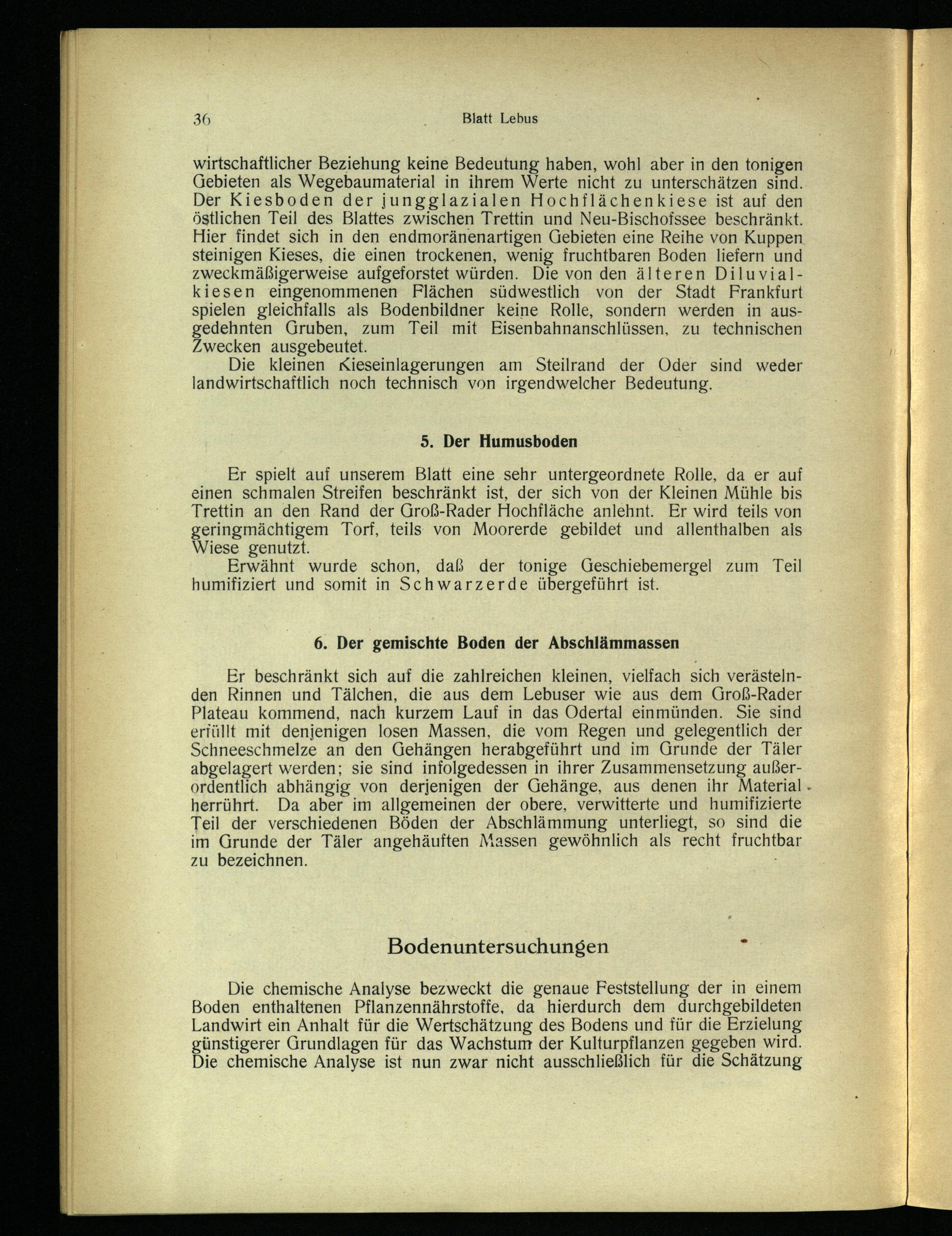 Er beschränkt sich auf die zahlreichen kleinen, vielfach sich verästelnden Rinnen und Tälchen, die aus dem Lebuser wie aus dem Groß-Rader Plateau kommend, nach kurzem Lauf in das Odertal einmünden. Sie sind erfüllt mit denjenigen losen Massen, die vom Regen und gelegentlich der Schneeschmelze an den Gehängen herabgeführt und im Grunde der Täler abgelagert werden; sie sind infolgedessen in ihrer Zusammensetzung außerordentlich abhängig von derjenigen der Gehänge, aus denen ihr Material herrührt. Da aber im allgemeinen der obere, verwitterte und humifizierte Teil der verschiedenen Böden der Abschlämmung unterliegt, so sind die im Grunde der Täler angehäuften Massen gewöhnlich als recht fruchtbar zu bezeichnen.;