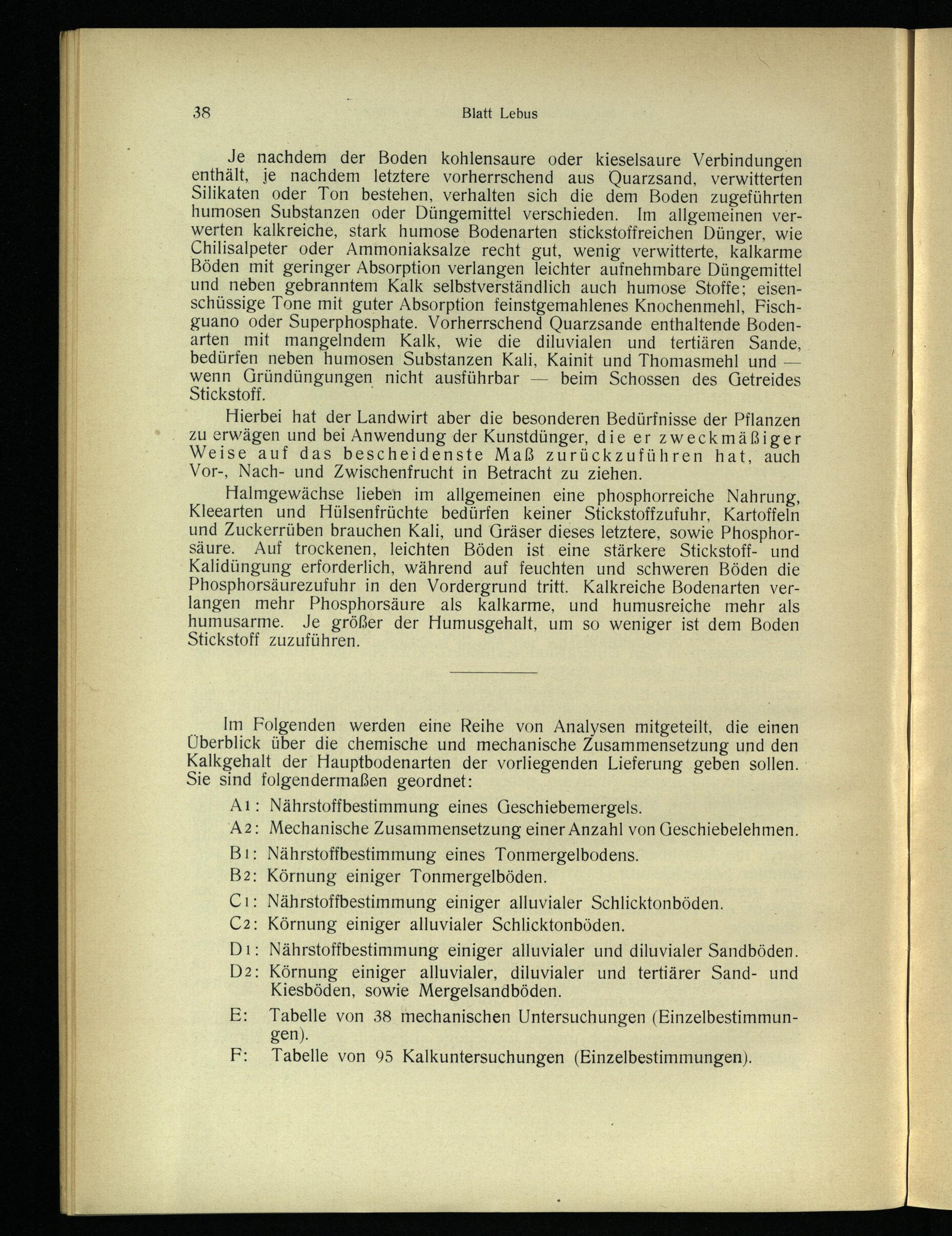 Im Folgenden werden eine Reihe von Analysen mitgeteilt, die einen Überblick über die chemische und mechanische Zusammensetzung und den Kalkgehalt der Hauptbodenarten der vorliegenden Lieferung geben sollen. Sie sind folgendermaßen geordnet: