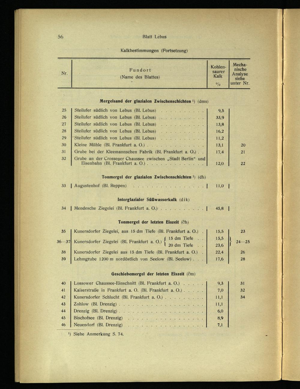 56 Blatt Lebus Kalkbestimmungen(Fortsetzung) Kohlen-| MechaN Fundort saurer US T. (Name des Blattes) Kalk sche 0/ unter Nr. Mergelsand der glazialen Zwischenschichten!)(dms) 25 Steilufer ‚südlich von Lebus (Bl. Lebus) 9,5 26 1 Steilufer südlich von Lebus {Bl Lebus)»... X. 33,9 27.| Steilufer südlich von Lebus (Bl. Lebus)....... 21. 13,8 28[| Steilufer südlich von Lebus (Bl. Lebus) 16,2 29 1 Steilufer südlich von Lebus (Bl. Lebus).‘.... 11,2 30 Kleine Mühle(Bl. Frankfurt a. O0.) 13,1 20 31 Grube bei der Kleemannschen Fabrik(Bl. Frankfurt a. O.).. 17,4 21 32 Grube an der Crossener Chaussee zwischen„Stadt Berlin “ und Eisenbahn (Bl Frankfurt a. 0)... 12,0 22 Tonmergel der glazialen Zwischenschichten!)(dh) 33.] Augustenhof:(Bl. Reppen}: HN 110°| Interglazialer Süßwasserkalk(dik) 34| Mendesche Ziegelei(Bl. Frankfurt a. OO) 0. 0 45,8| Tonmergel der letzten Eiszeit(Öh) 35 Kunersdorfer Ziegelei, aus 15 dm Tiefe(Bl. Frankfurt a. O.). 15:5 23 ). f 15 dm Tiefe. 15,5 36—937| Kunersdorfer Ziegelei(Bl. Frankfurt a. O.)‘ U 24—25 N .\ 20. dm Tiefe:=, 23,09 38 Kunersdorfer Ziegelei aus 15 dm Tiefe(Bl. Frankfurt a. O.). 22,4 26 39 Lehmgrube 1200 m nordöstlich von Seelow (Bl. Seelow)... 17,6 28 Geschiebemergel der letzten Eiszeit(Om);) 40 Lossower Chaussee-Einschnitt(Bl. Frankfurt a. O0.).....| 9,3 31 41 Kaiserstraße in Frankfurt a. O.(Bl. Frankfurt a. O.)..... 7,0 32 42 Kunersdorfer Schlucht.(Bl. Frankfurt a. O0.). 4. 11,1 34 N 43| Zohlow-(BE Drenzig) 111 44| Drenzig(Bl. Drenzig) 0 6,0 45 Bischofsee(Bl. Drenzig)..... A 8,9 46| Neuendorf(Bl. Drenzig): 2 7,1